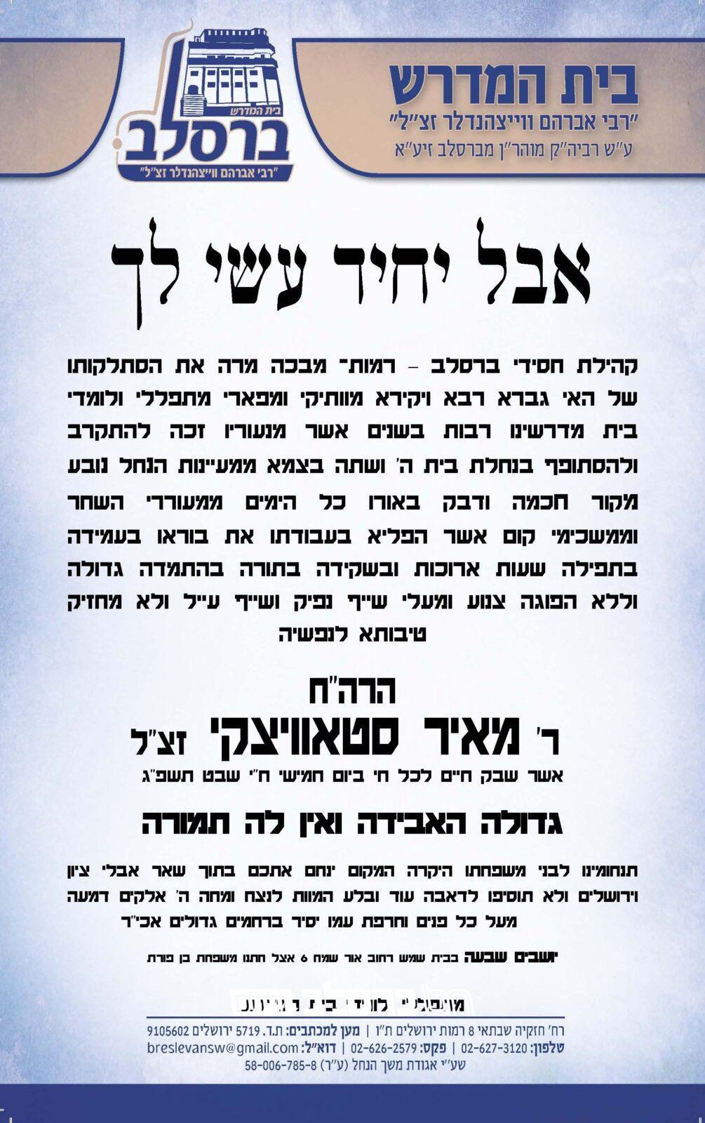 בָּרוּךְ דַּיַּן הָאֱמֶת • ביום חמישי האחרון הלך לעולמו הרה"ח רבי מאיר סטאויצקי זצ"ל (80) בן הרה"ח רבי ישראל גבריאל זצ"ל מזקני אנשי שלומינו בשכונת רמות, ירושלים, ובעל הספר 'פדיון נפש':