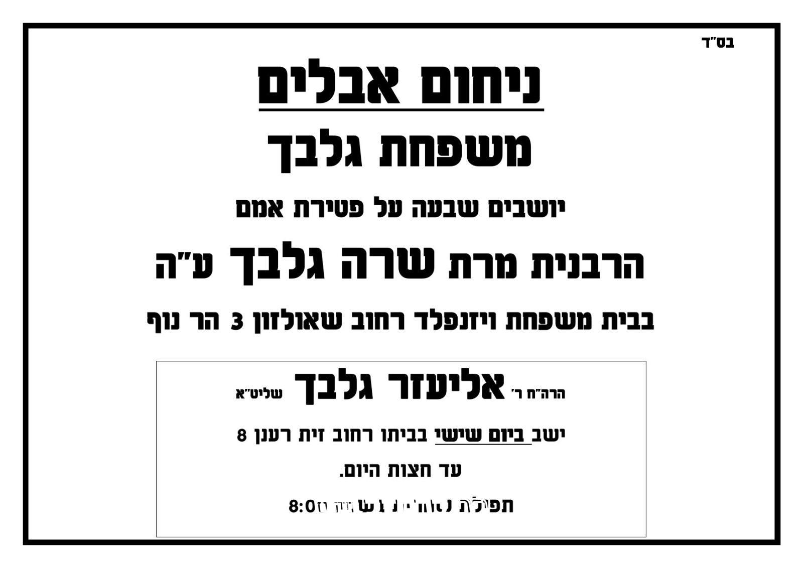 מעמד הקבורה: הרבנית מרת שרה גלבך ע"ה |◄