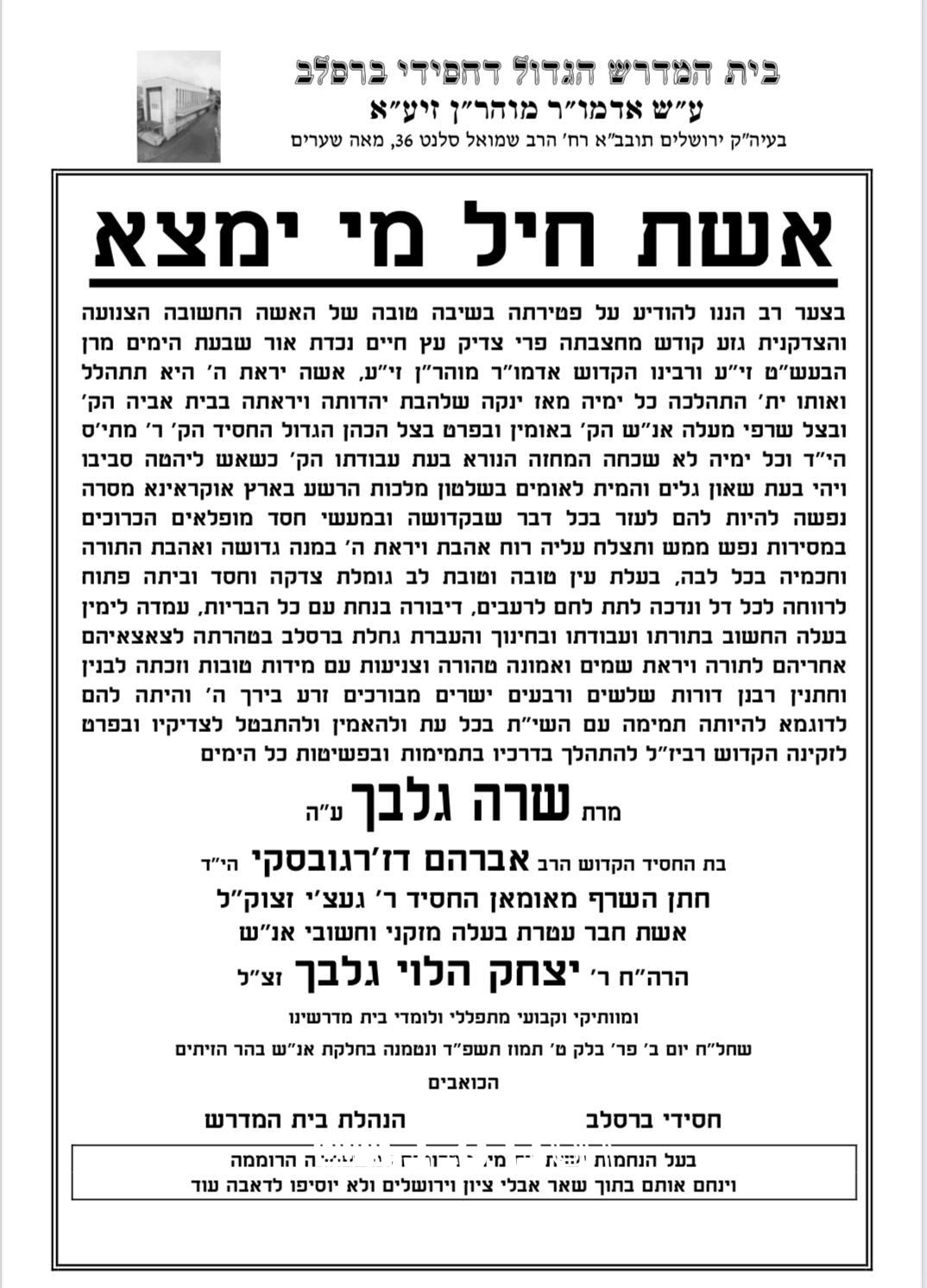 "פְּרִי צַדִּיק עֵץ חַיִּים": הבוקר נפטרה הרבנית הצדקנית מרת שרה גלבך ע"ה (102) נכדת רבינו הקדוש רבי נחמן מברסלב, אשת הרה"ח המפואר