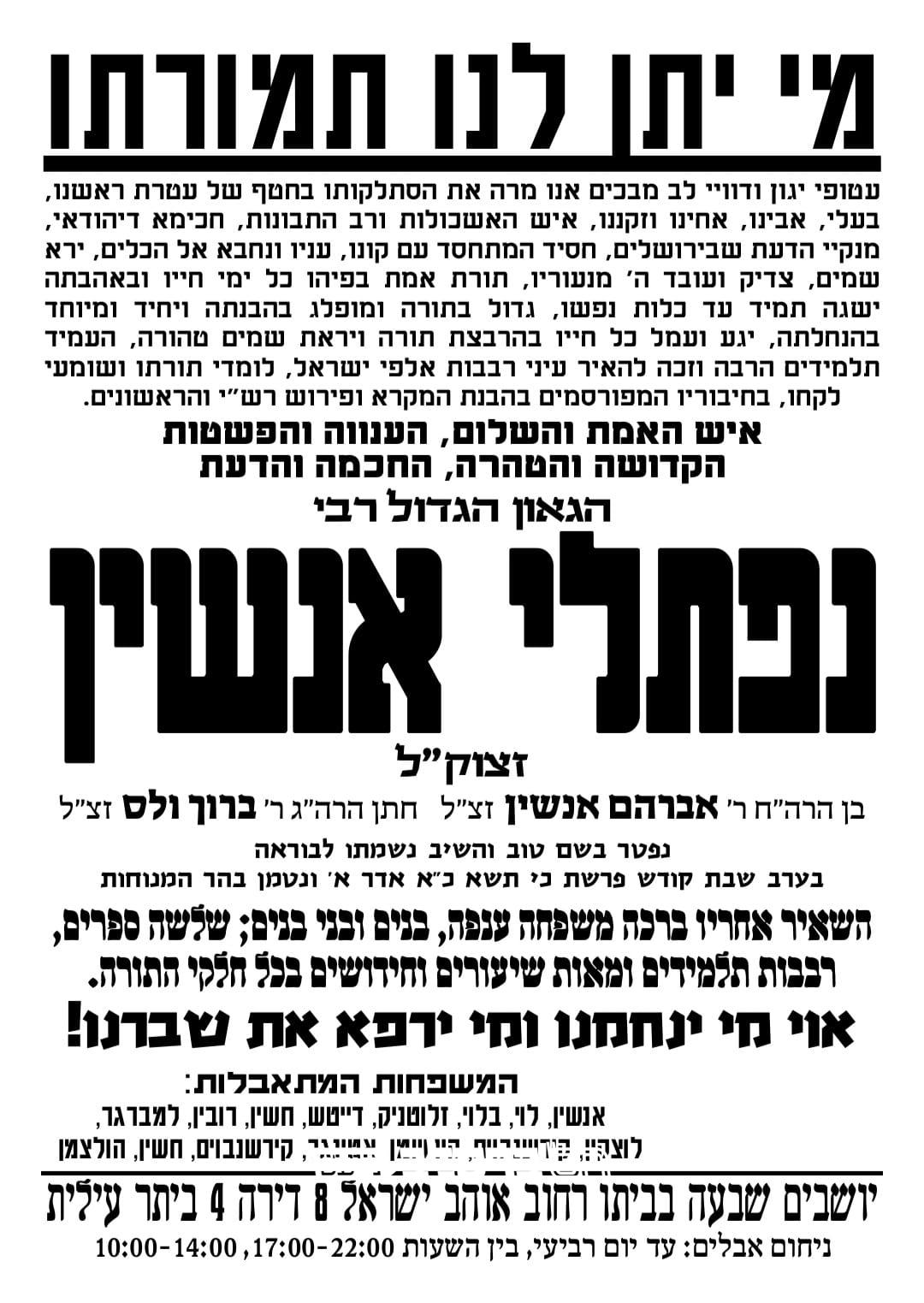 בָּרוּךְ דַּיַּן הָאֱמֶת • ביום שישי האחרון הלך לעולמו הרה"ח רבי נפתלי אנשין זצ"ל (66) מיקירי אנשי שלומינו בעיר ביתר עילית: