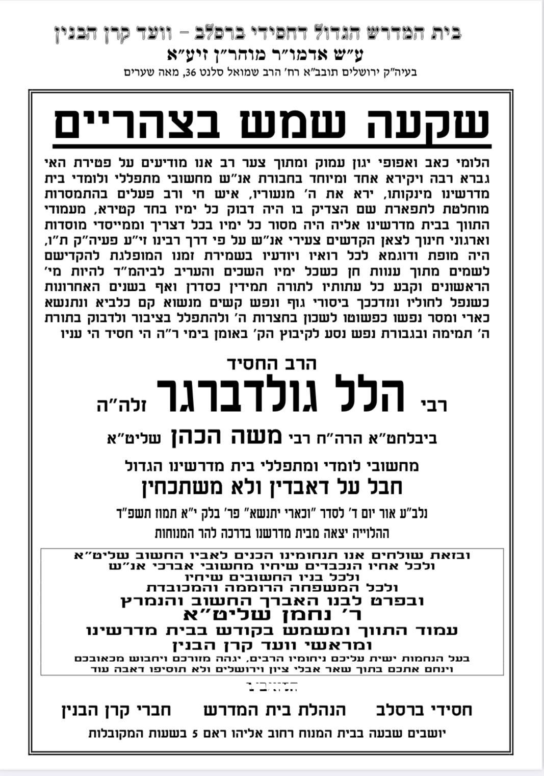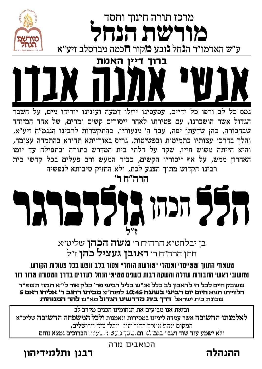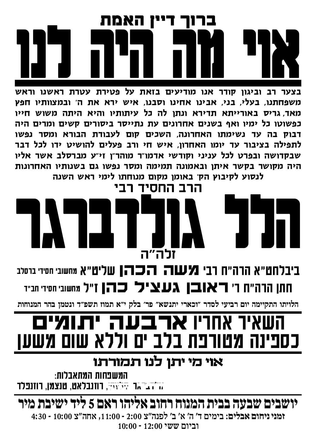 כארבעה חודשים לאחר אמו: בדקות האחרונות התפשטה הבשורה הקשה על הסתלקותו טרם עת של הרה"ח המפואר רבי הל הכהן גולדברגר זצ"ל מיקירי אנשי שלומינו בעיר רבתי עם ירושלים עיה"ק. זאת כארבעה חודשים לאחר פטירתו הפתאומית של אמו החשובה מרת נחמה גולדברגר ע"ה. והוא בן 52 שנה בלבד בפטירתו.