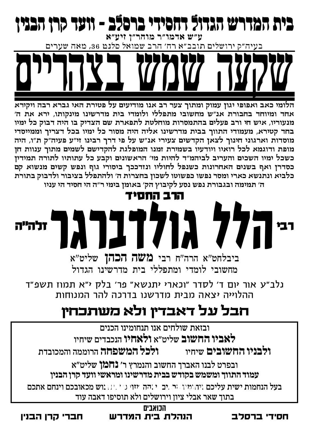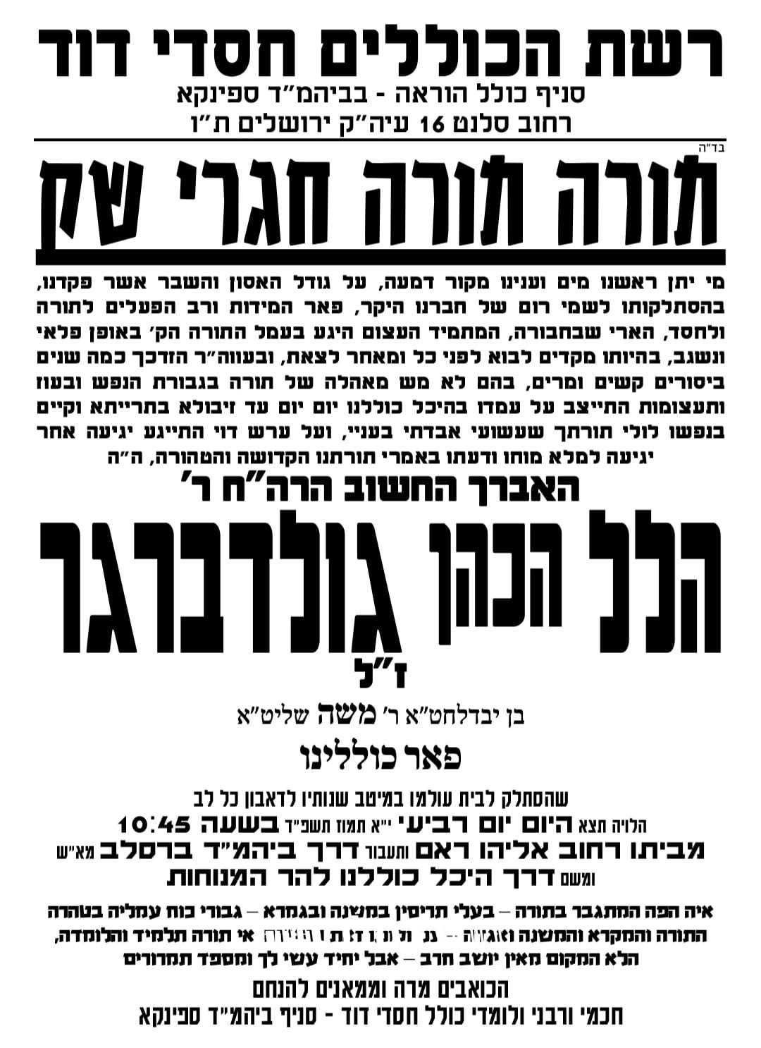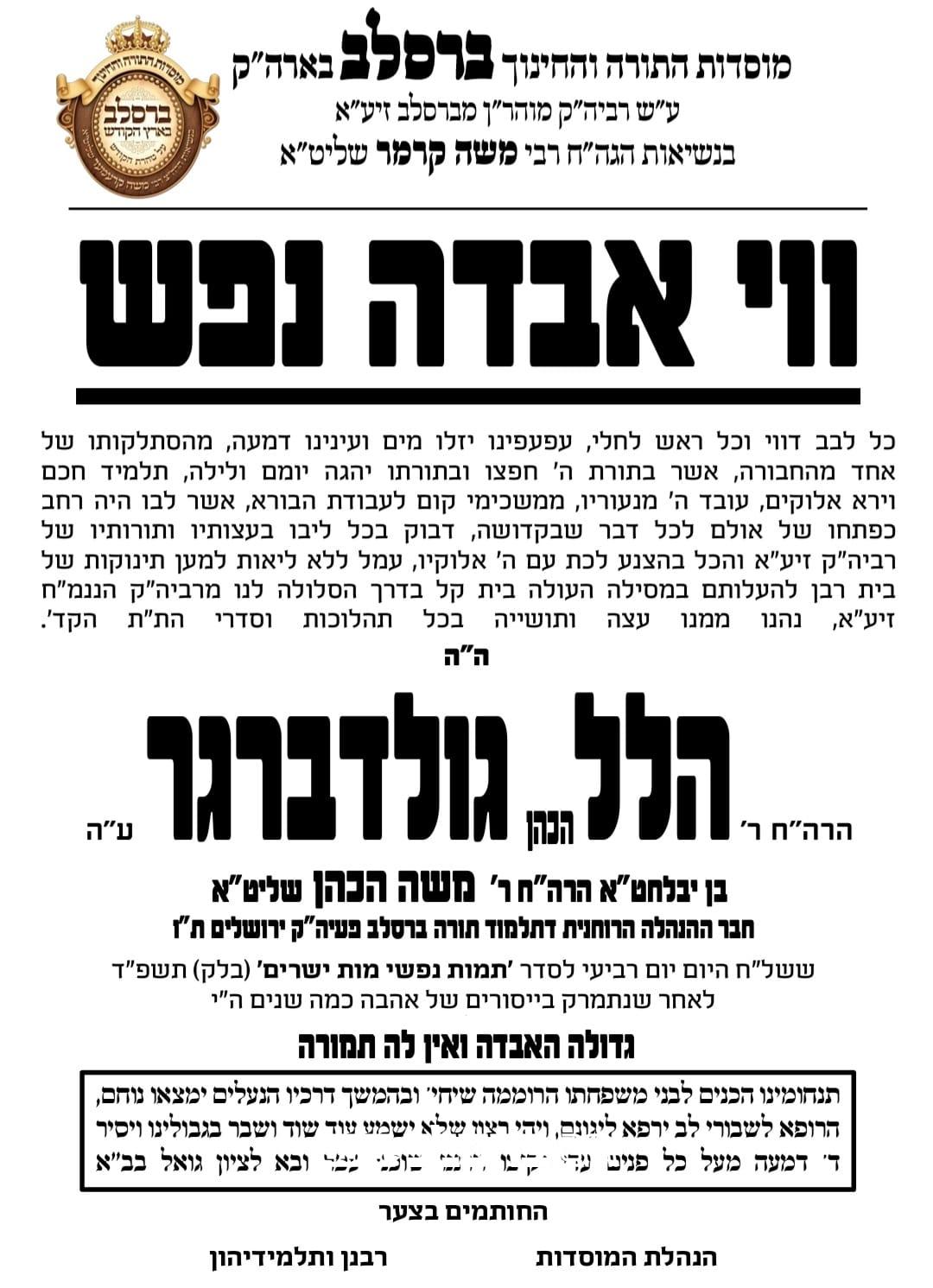 כארבעה חודשים לאחר אמו: בדקות האחרונות התפשטה הבשורה הקשה על הסתלקותו טרם עת של הרה"ח המפואר רבי הל הכהן גולדברגר זצ"ל מיקירי אנשי שלומינו בעיר רבתי עם ירושלים עיה"ק. זאת כארבעה חודשים לאחר פטירתו הפתאומית של אמו החשובה מרת נחמה גולדברגר ע"ה. והוא בן 52 שנה בלבד בפטירתו.