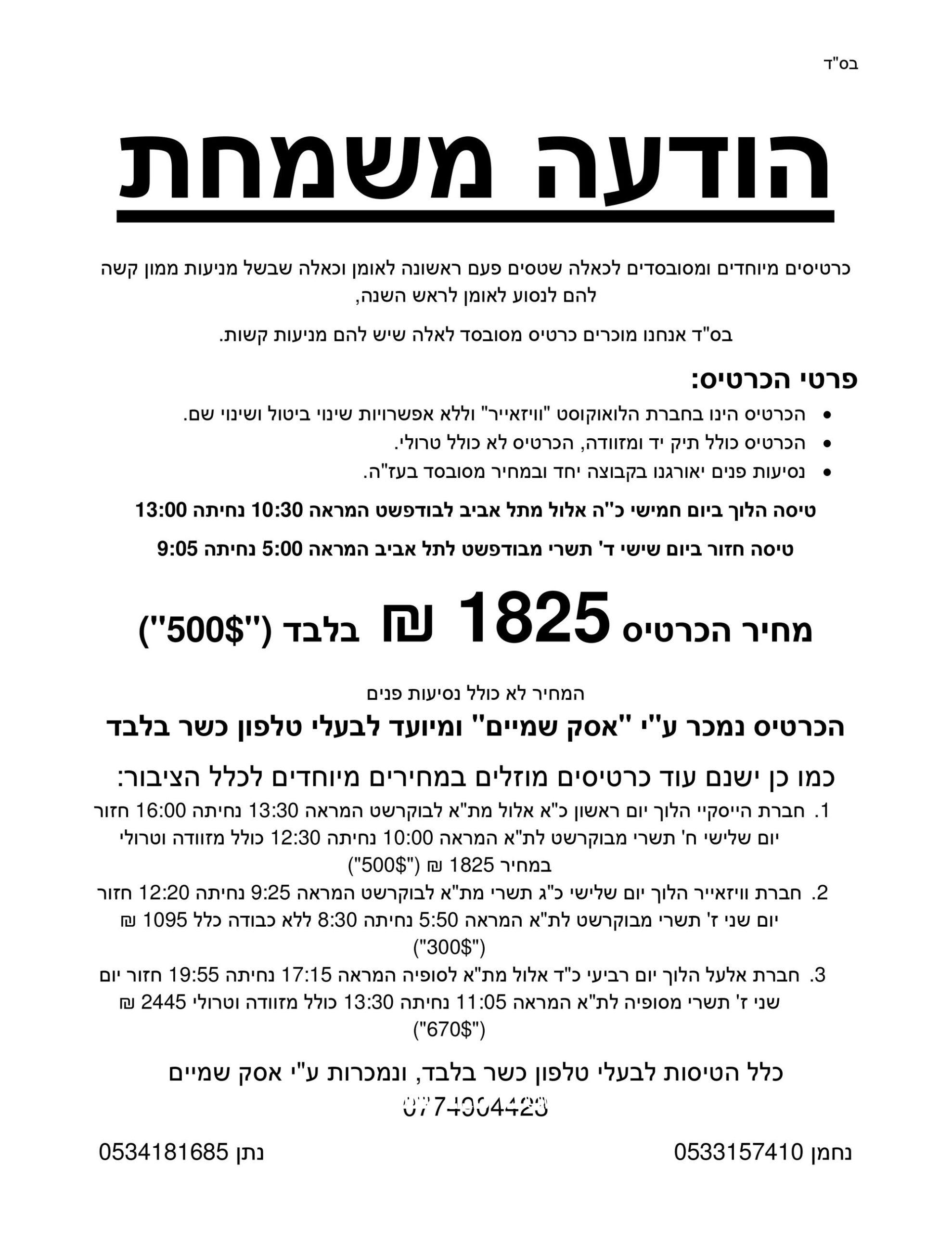 • מחיר הכרטיס 1825 ₪ בלבד (500$)