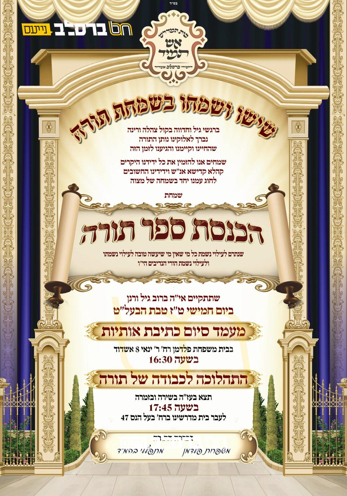 המעמד יערך בעזהי"ת ביום חמישי (ויחי) הבעל"ט (ט"ז טבת), בו ייכנס 'ספר התורה' המהודר ברוב פאר והדר בשערי בית הכנסת 'אש תמיד' דחסידי ברסלב שברחוב בעל הנס 47, אשדוד.