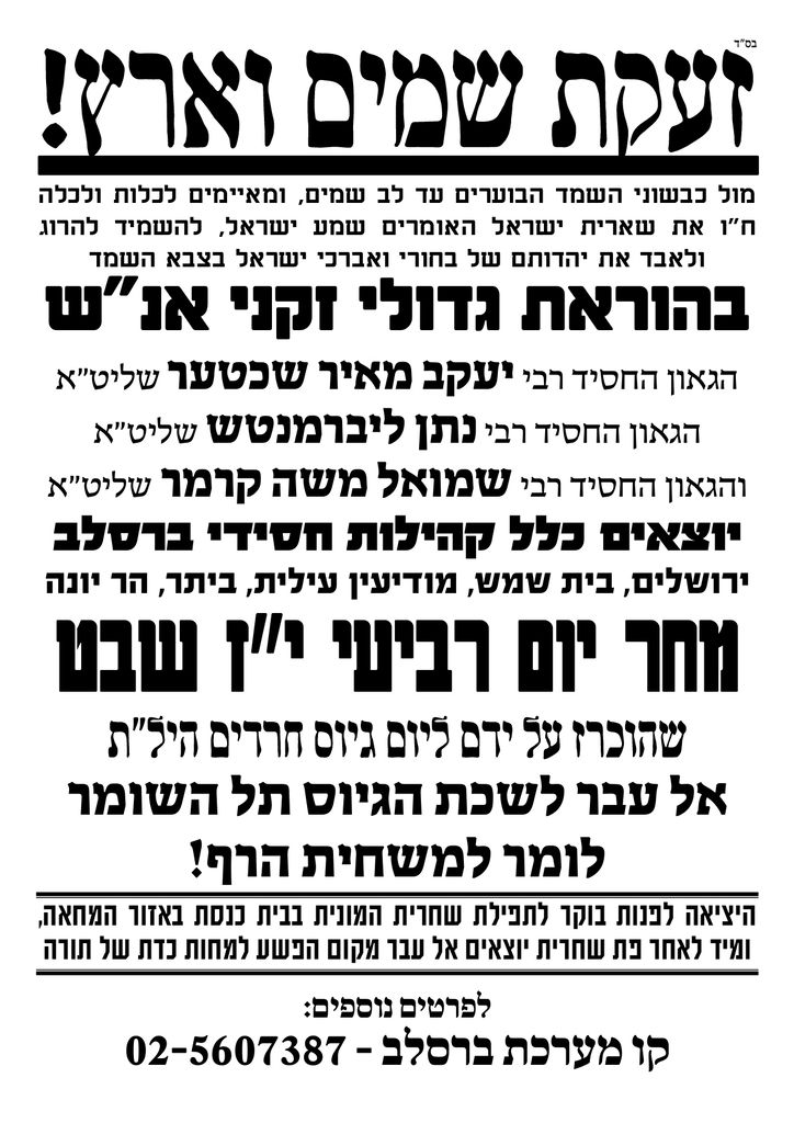 לאור הוראתם של הרבנים גדולי זקני אנ"ש הגה"צ רבי יעקב מאיר שכטער שליט"א הגה"צ רבי משה קרמר שליט"א והגה"צ רבי נתן ליברמנש שליט"א נערכים כלל אנ"ש חסידי ברסלב לצאת ביום רביעי לעבר לשכת הגיוס תל השומר בראשות חשובי משפעי אנ"ש שליט"א להציל בחורים נופלים ולעמוד לצידם בשעתם הקשה ולהכריז כי לא עוד!