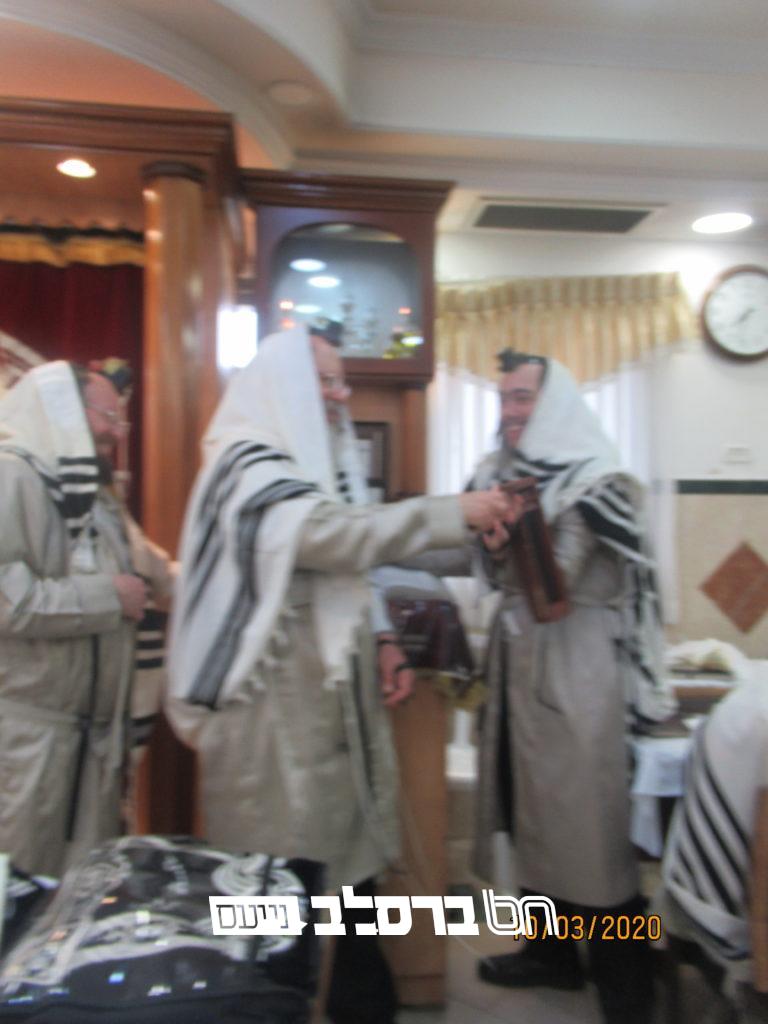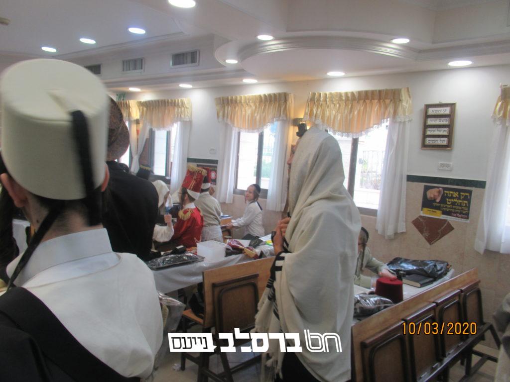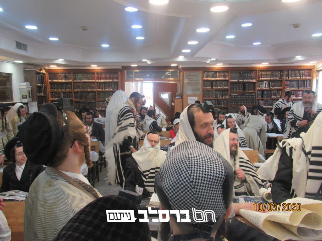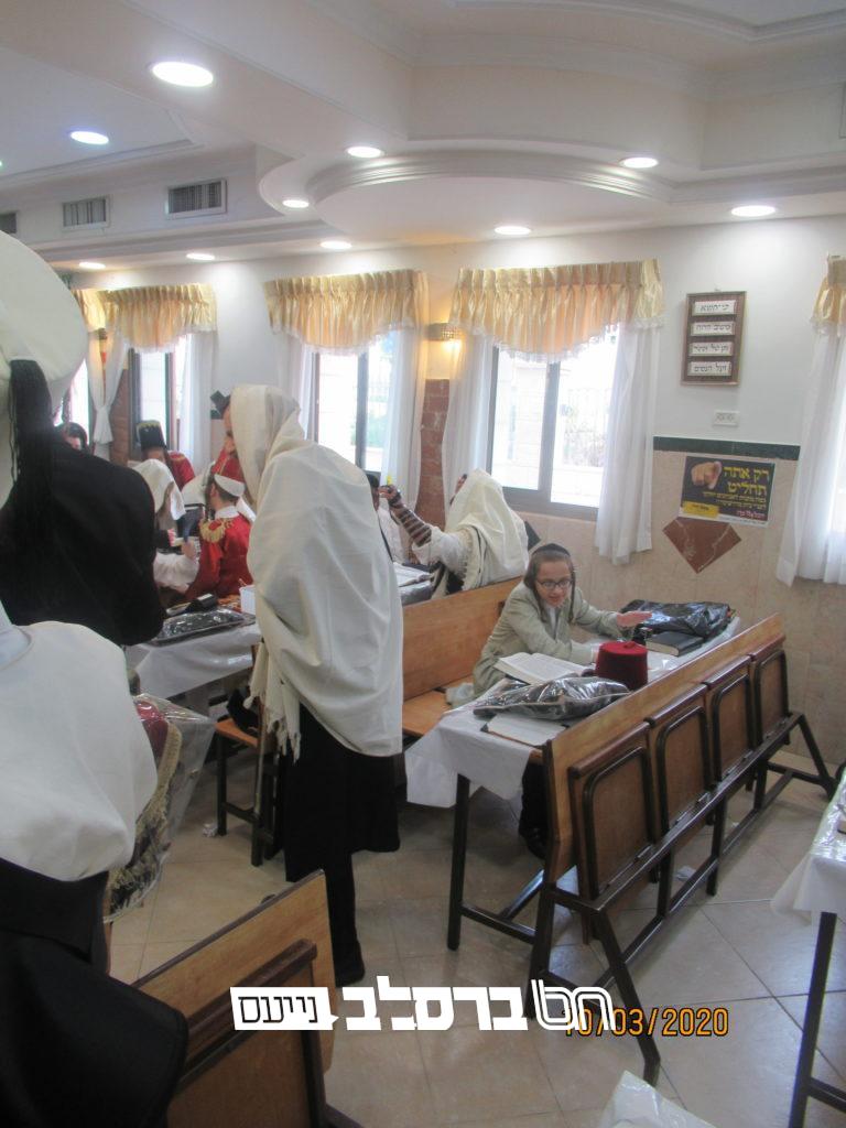 אנשי שלומינו חסידי ברסלב מתפלי ביהמ"ד "תפארת הנחל" בית שמש בקרייה החרדית, שבראשות הגה"צ רבי יעקב מאיר שכטער שליט"א בקריאת המגילה בבוקר יום הפורים.