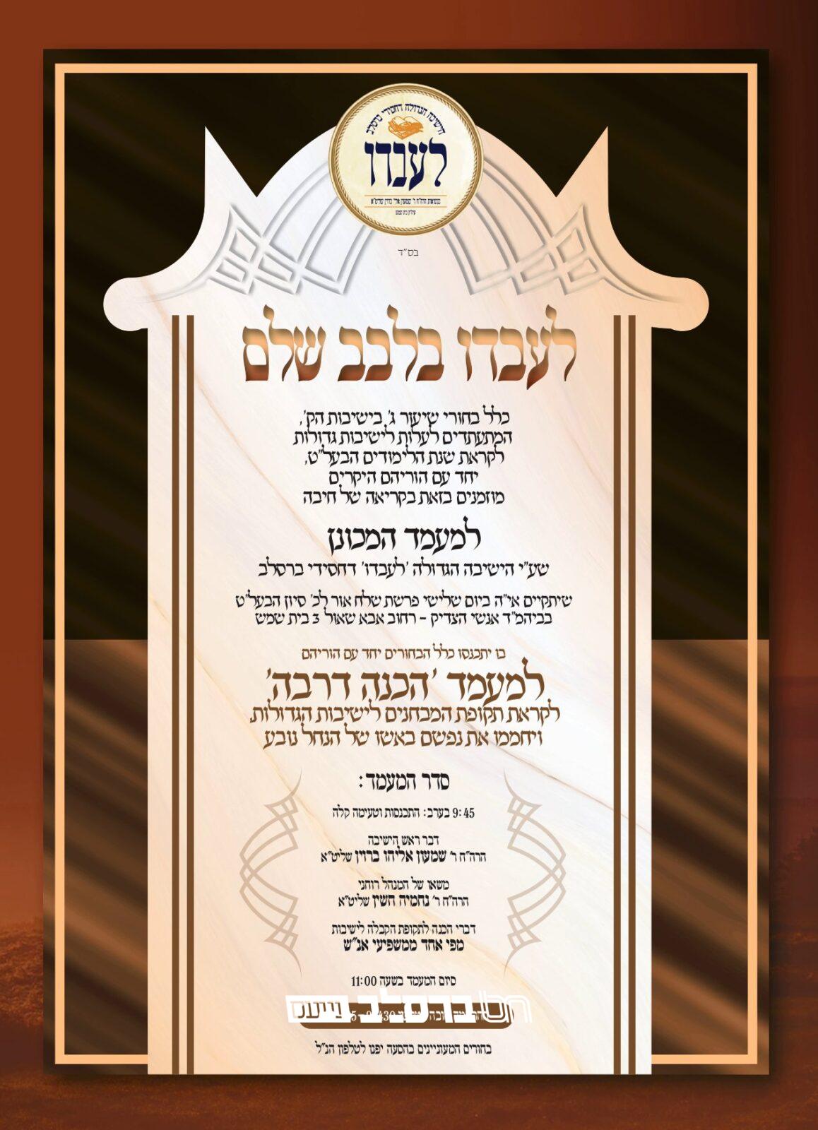 כעת, לקראת הזמן הקרב ובא, ייערך ברצות ה' מעמד מכונן המיועד לכלל בחורי אנ"ש חסידי ברסלב לומדי שיעור ג' מכלל הישיבות הקטנות, יחד עם הוריהם, בו יושמעו דרשות מיוחדות כהכנה דרבה לקראת תקופת הקבלה לישיבות. במעמד זה ניתן יהיה גם לשוחח עם רבני 'ישיבת לעבדו' ולהתרשם מקרוב מסדרי הישיבה ומעלותיה.