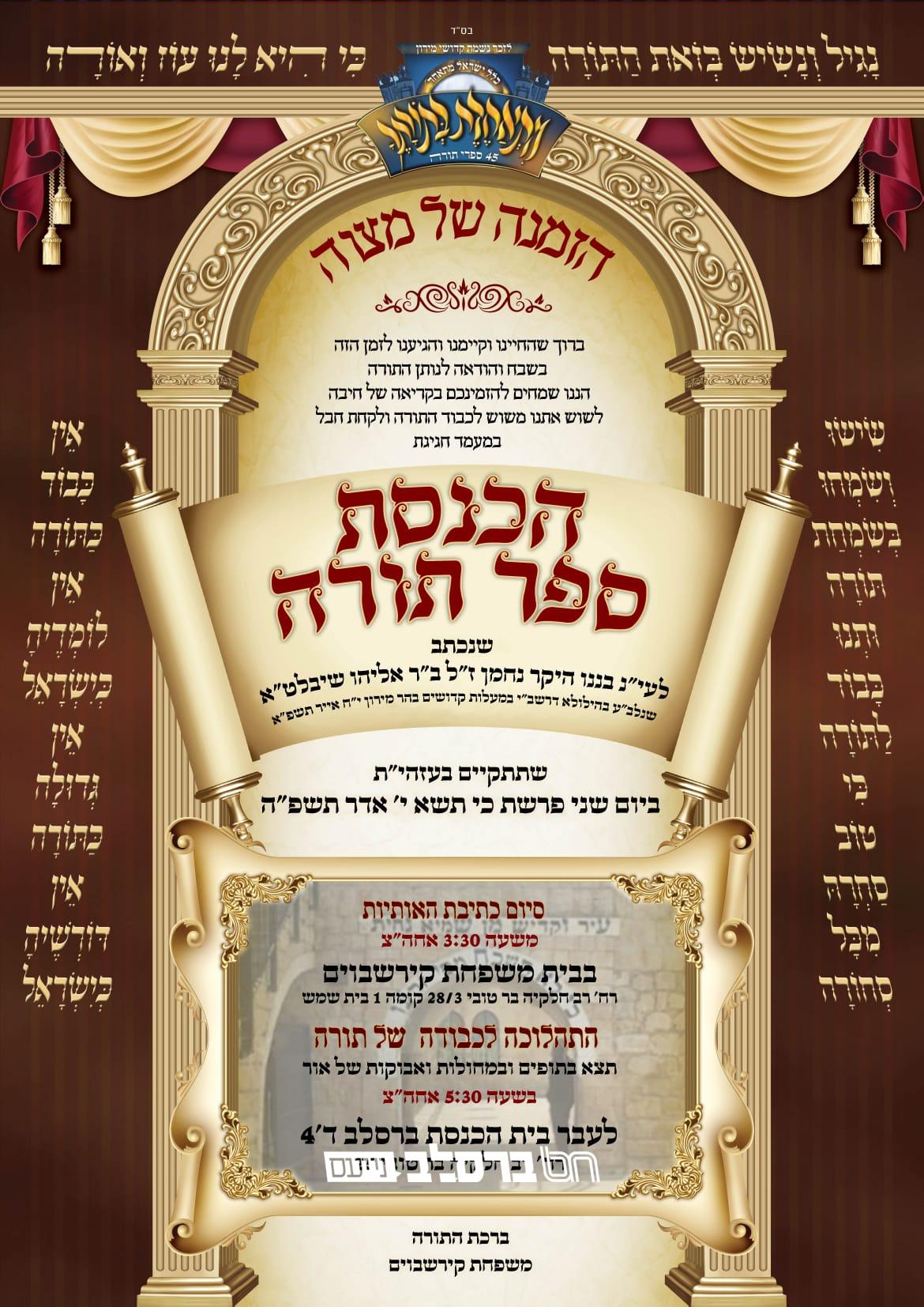 בשבועות האחרונים נערך מעמד רב רושם של הכנסת ספר תורה מרגש ביותר שנכתב לע"נ הבחור המצוין נחמן קירשבוים ז"ל שנהרג באסון מירון, הסתפר התורה נכנס ברוב פאר והדר לבית הכנסת 'ברסלב' רמה ד' 4 בית שמש, , בהשתתפות המוני משתתפים ובראשות הרבנים גדולי משפעי אנ"ש שליט"א ובראשם הגה"צ רבי נתן ליברמנש שליט"א.