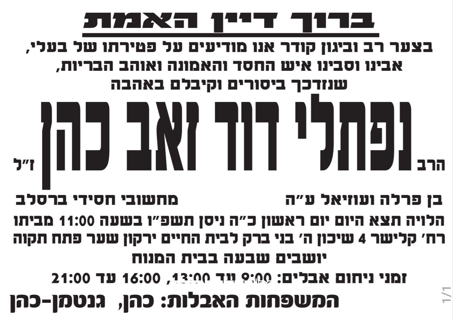 חדשות ברסלב • ביום ראשון האחרון (כ"ה ניסן) הסתלק לבית עולמו הרה"ח ר' נפתלי דוד זאב כהן זצ"ל מיקירי אנשי שלומינו חסידי ברסלב בעיר בני ברק. והוא בן 79 שנה בלבד בפטירתו.
