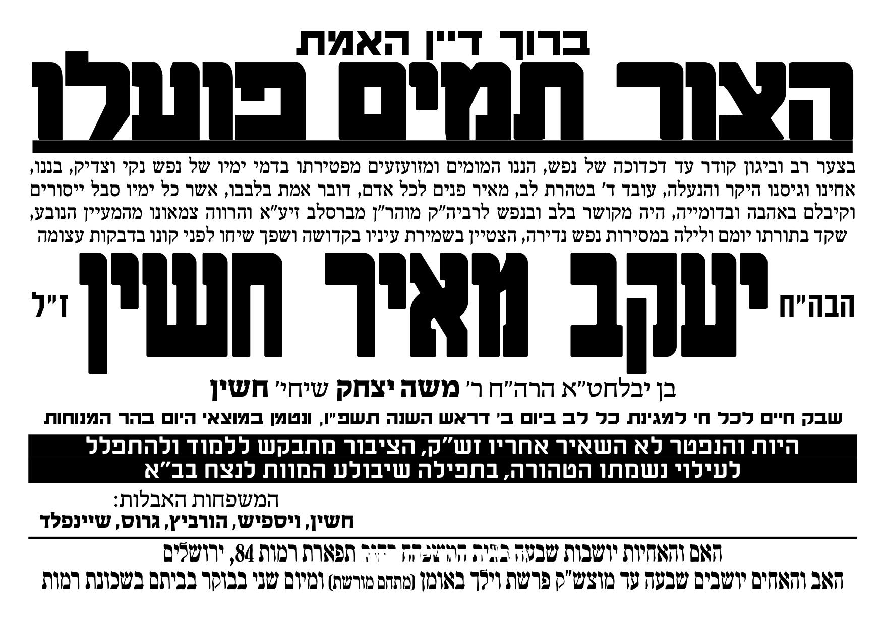 ברוך דיין האמת: בעיצומו של יום ראש השנה (היום השני של ראש השנה, ב' תשרי תשפ"ו) הסתלק לבית עולמו הבחור החשוב, נפש נקי וצדיק יעקב מאיר חשין ז"ל, משכונת רמות בירושלים והוא בן 33 בפטירתו.