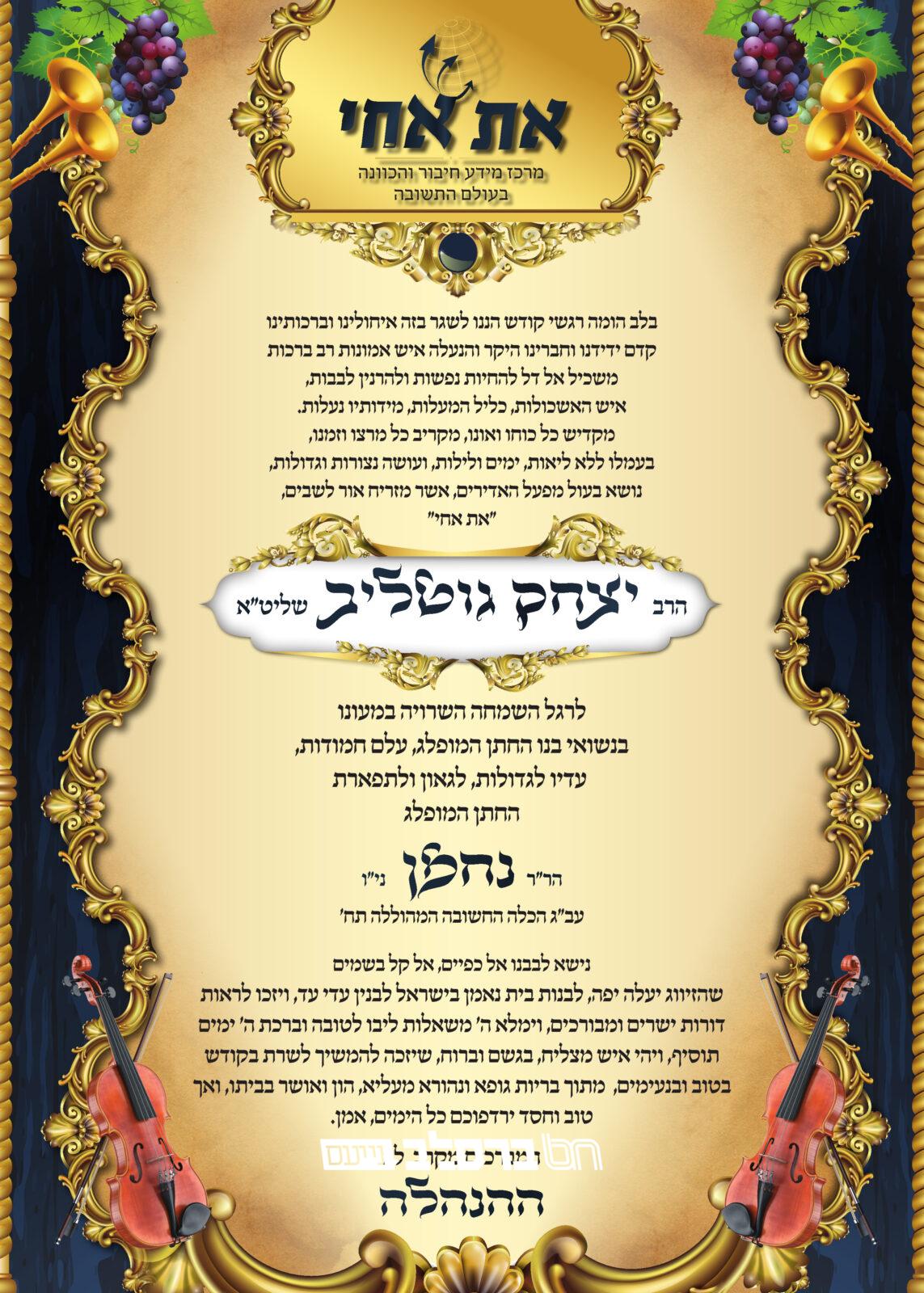 לרגל השמחה השרויה במעונו דיצה וחדוה בארמונו בנשואי בנו יקירו החתן המופלג הר"ר נחמן הי"ו עב"ג הכלה המעוללה נכדת רבינו הקדוש זיע"א בת הרה"ח ר' חיים יהודה סטארט שליט"א.