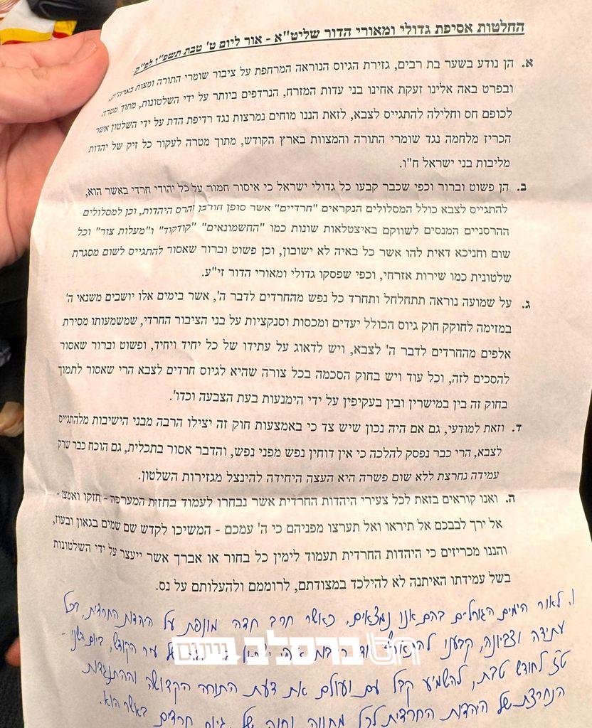 ו. לאור הימים הגורליים בהם אנו נמצאים, כאשר חרב חדה מונפת על היהדות החרדית, ועל עתידה וצביונה, קבענו להתכנס יחד רבבות אלפי ישראל ברחובה של עיר הקודש, ביום שני – ט"ז חודש טבת, להשמיע קול זעקה ומחאה נגד חוק גיוס חרדים לצבא רח"ל.