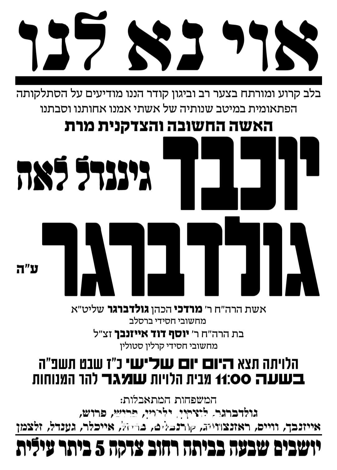 בשעות הבוקר התפשטה הבשורה הקשה על הסתלקותה הפתאומית של האישה החשובה מרת יוכבד גיננדל לאה גולדברגר ע"ה (56) אשת הרה"ח ר' מדכי הכהן גולדברגר שליט"א מיקירי אנ"ש חסידי ברסלב, בעיר ביתר עילית, כאשר היא מותירה אחריה חמישה יתומים בביתה: