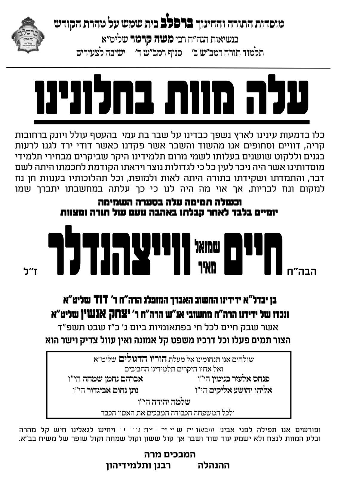 כלל אנ"ש בעיר בית שמש המומים ומזועזעים עם התפשטות הבשורה המזעזעת על פטירתו הטראגית של נער החמודות הבחור הטהור חיים שמואל מאיר ויצהנדלר ז"ל שזכה להניח תפילין פעמיים בימי חיו בנו של האברך הרה"ח ר' דוד ויצהנדלר שליט"א יבלח"ט, מפארי יקירי אנשי שלומינו בעיר בית שמש, מתפלל קבוע בבית מדרשינו 'אנשי הצדיק' – ברסלב, שכונת חפציבה.