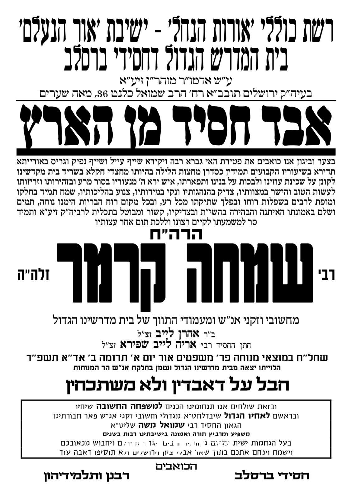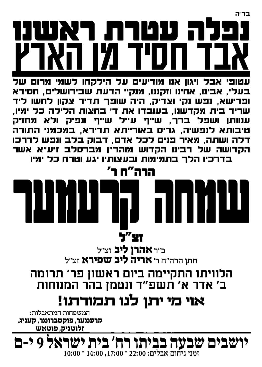 חדשות ברסלב • בשעות הבוקר התפשטה הבשורה הקשה על הסתלקו של הרה"ח המפואר רבי שמחה קרמר זצ"ל מזקני חשובי אנשי שלומינו, מתפלל בבית הכנסת הגדול שבירושלים, ה'שוהל' המרכזי שבשכונת מא"ש. והוא בן 80 שנה בפטירתו.