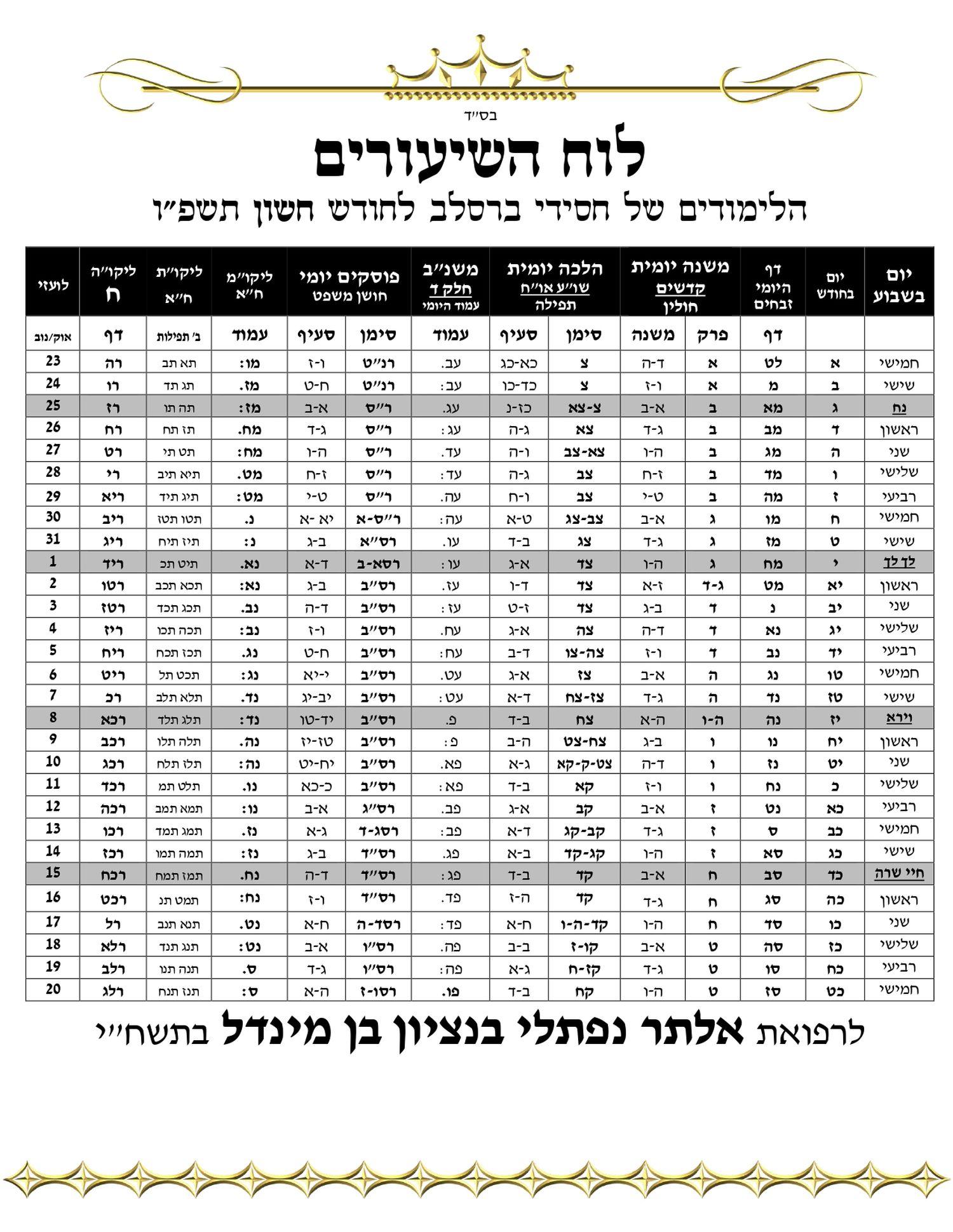 לוח הלימוד – דף היומי 'בליקוטי הלכות' לשנת תשפה • ברסלב נייעסהורד