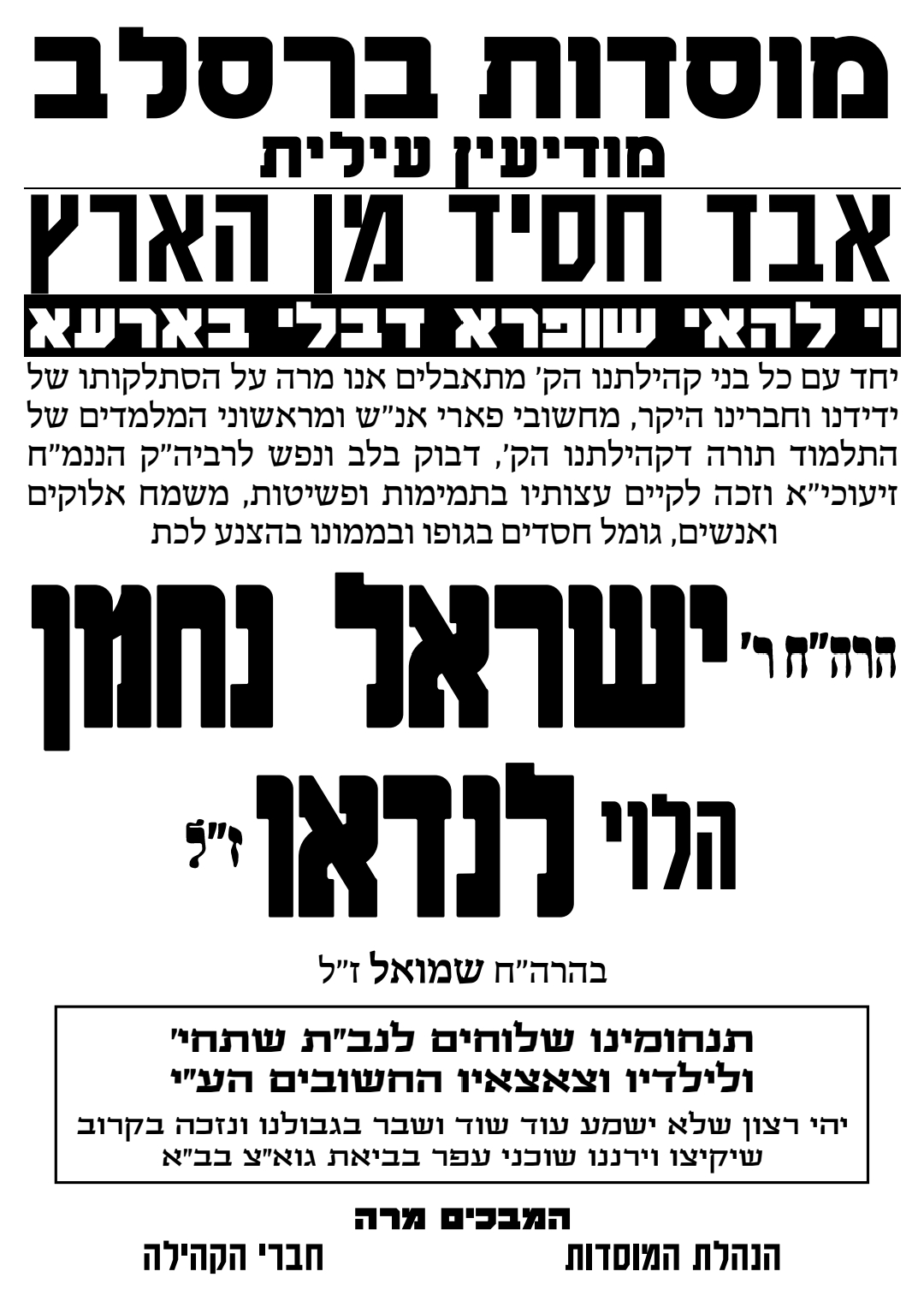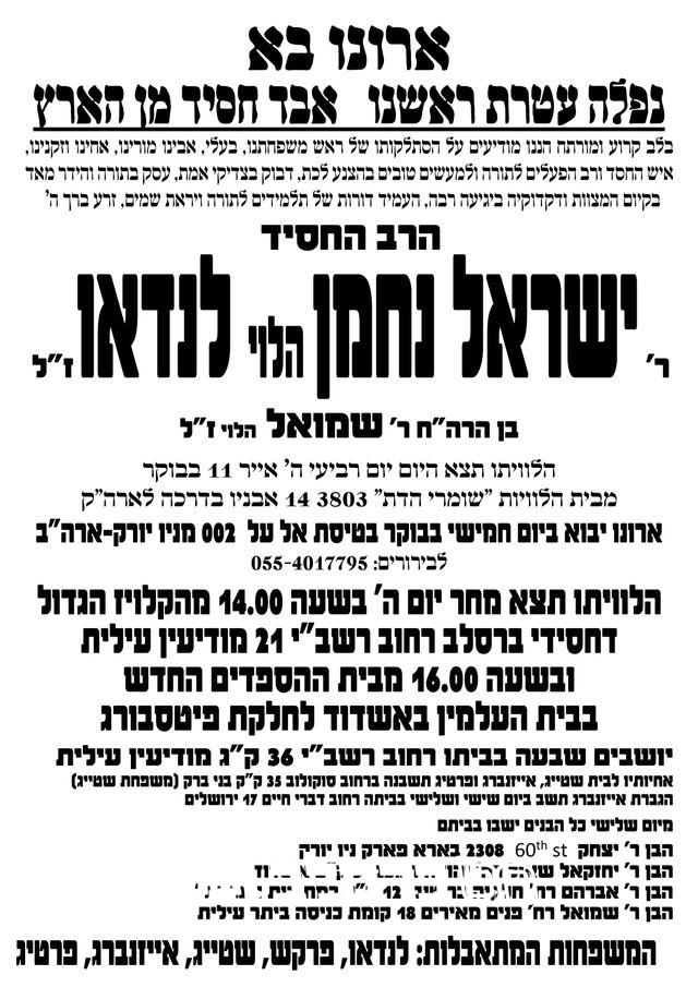 • ארונו בא: רבי ישראל נחמן לנדאו זצ"ל מיקירי אנ"ש בברכפלד