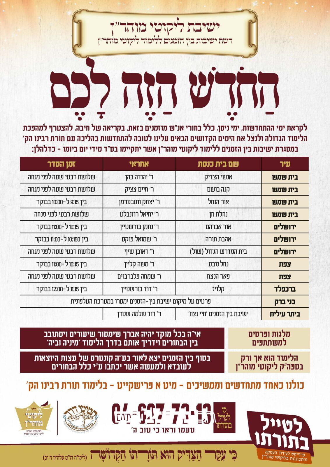 לוחות קהילת חסידי ברסלב "קרן אור" שבנשיאות הגה"צ רבי יעקב מאיר שכטער שליט"א עם 11 מזמני היום וסדרי הלימודים היומיים הנהוגים אצל אנשי שלומינו חסידי ברסלב הע"י, לערים: ירושלים – לפי האופק שם, ובית שמש – לפי האופק שם.