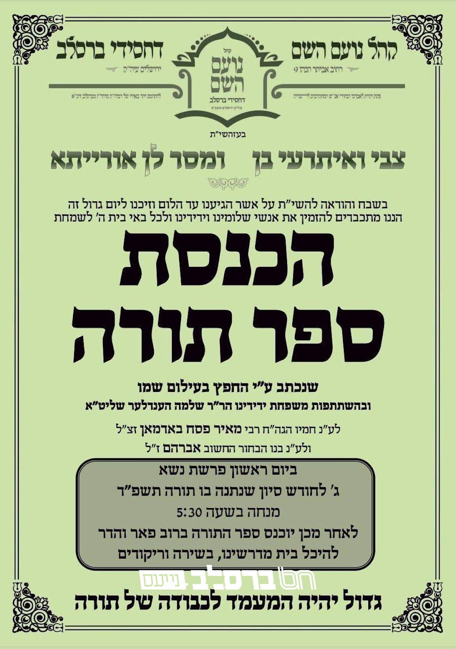 ספר התורה המהודר נכתב ונתרם ע"י החפץ בעילום שמו, ובהשתתפות משפחת ידידינו הנכבד מאוד נעלה הרה"ח ר' שלמה הנדלר שליט"א, מחברי מערכת 'ברסלב נייעס', שהרימו את תרומתם ההגונה והוזילו זהב וכסף לכתוב ספר תורה מהודר ולכבוד התורה ולומדיה. לע"נ חמיו הגה"ח רבי מאיר פסח באדמאן זצ"ל, ולע"נ בנו הבחור החשוב אברהם ז"ל.