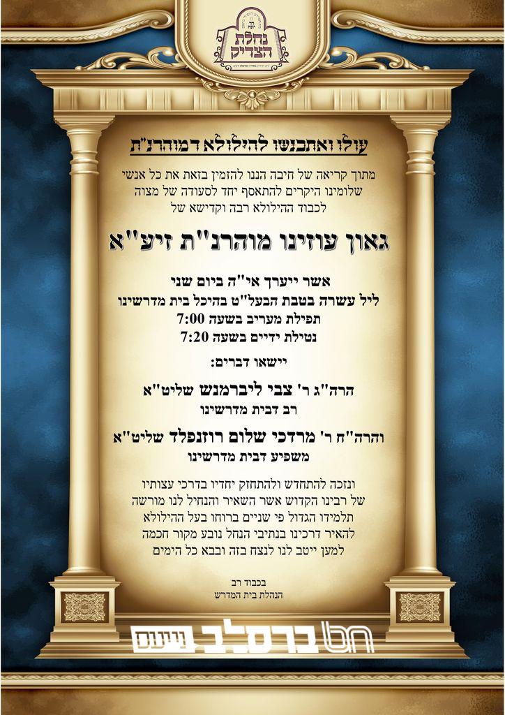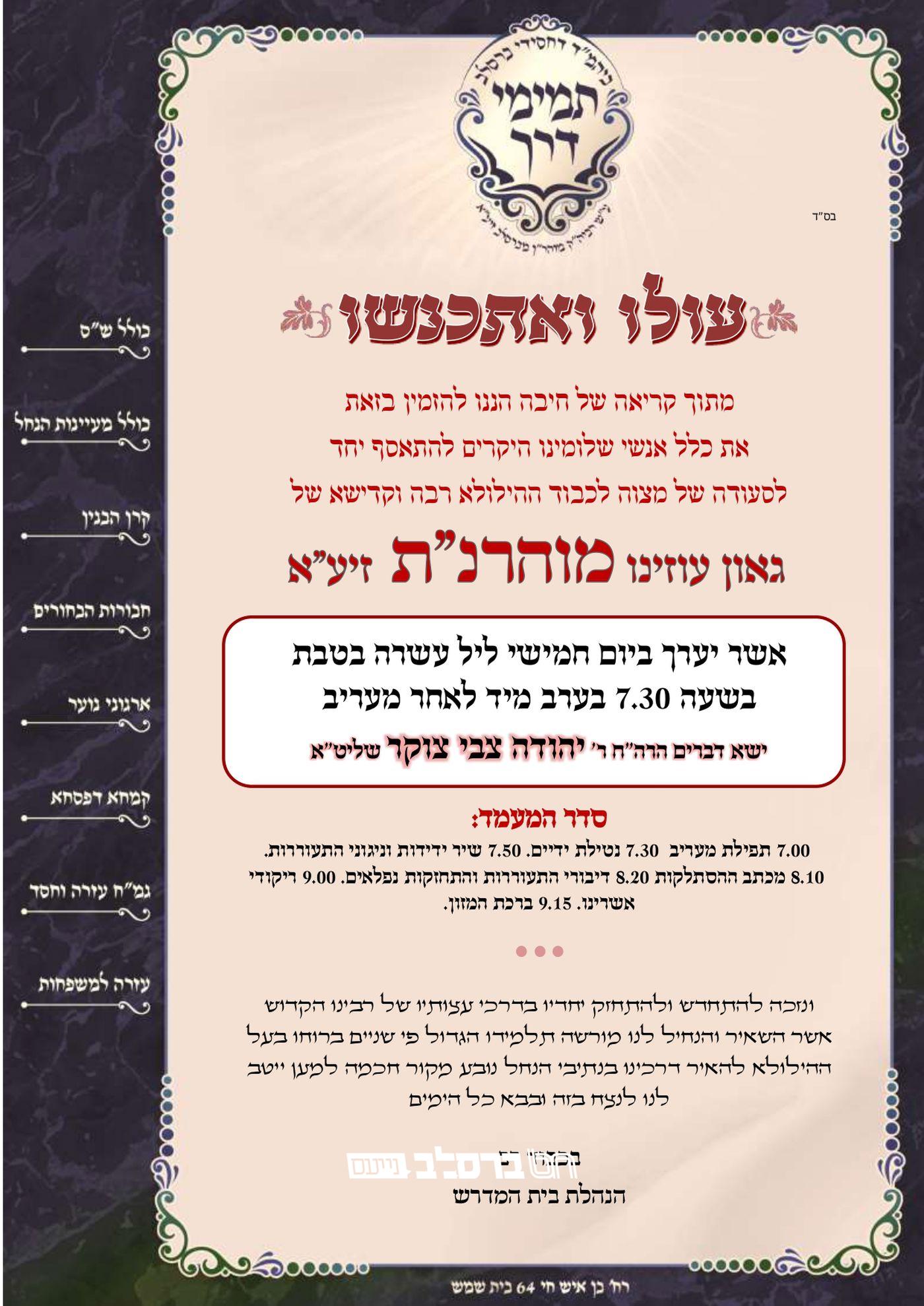 ||| לפניכם כמה ממודעות המבשרים על מעמדי ההילולות השונות ברחבי העולם, וכן על ירידי ספרים המרכזיים – שהגיעו למערכת – המודעות מתעדכנות בהתאם לקבלתם: