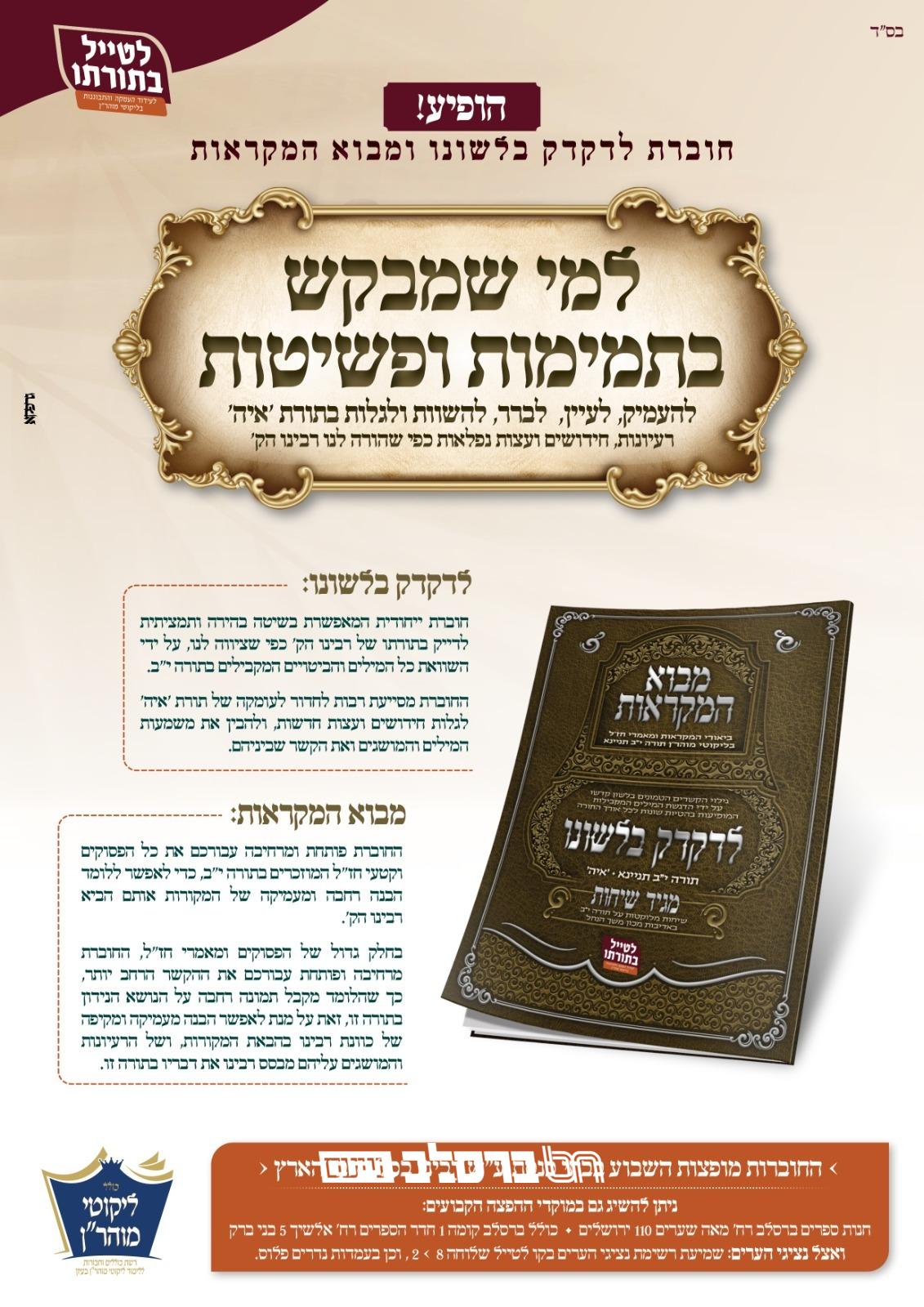 הושלמה עריכת והוצאת הקונטרסים המיוחדים והמועילים 'מבוא המקראות' ו'לדקדק בלשונו', ובימים אלה הם מופצים בכל ריכוזי אנ"ש בארץ ובעולם, ואצל הנציגים הפזורים ברחבי הארץ.