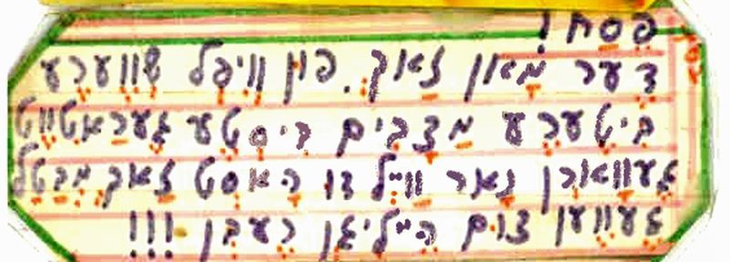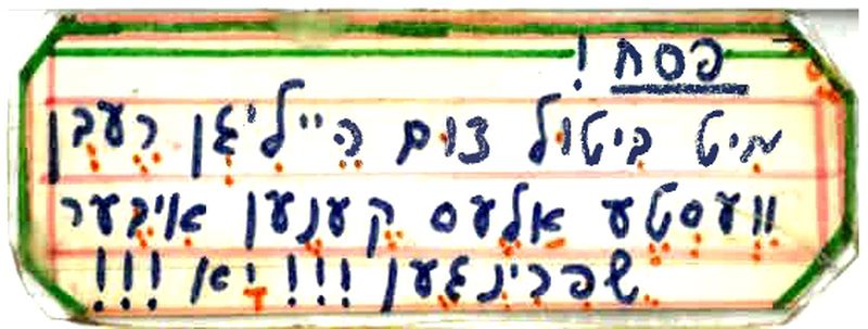 כתב על השעון במטבח "כאפ אריין כל זמן דו קענסט ויפיל די קענסט" [תחטוף כל זמן שאתה יכול, כמה שאתה יכול—] עם תמונה מושקעת מאד של סחיבת תורה ומצוות לבית של מעלה, והיה ממחיש וחוזר ואמר כשנהיה באדמה מתחת למציבה לא יהיה לנו שום דבר וכתב וחזר הרבה על מאמר חז"ל עולם הבא דומה לים, עולם הזה דומה ליבשה – כי שם הכל יקר!!! ורק זה מה שילווה אותנו. "כי לא במותו יקח הכל ולא ירד אחריו כבודו". היה קטע מחובות הלבבות שהדביק בקריאת שמע שעל המיטה שלו – שהיה אומר בזה כארבעים שנה, על צידה לדרך של הנשמה.