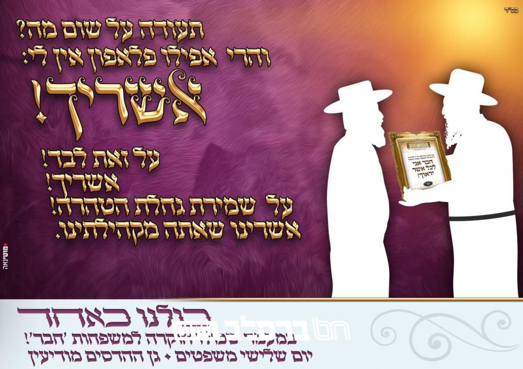 מאות משפחות קהילת חסידי ברסלב שבראשות הגאון הצדיק רבי יעקב מאיר שכטער שליט"א יחגגו ויודו לה' במעמד החגיגי וההיסטורי 'טהורים יירשוה' ביום שלישי (משפטים) הקרוב על קדושתנו וטהרתנו, כרטיסי כניסה נשלחו לבתי אנשי הקהילה.