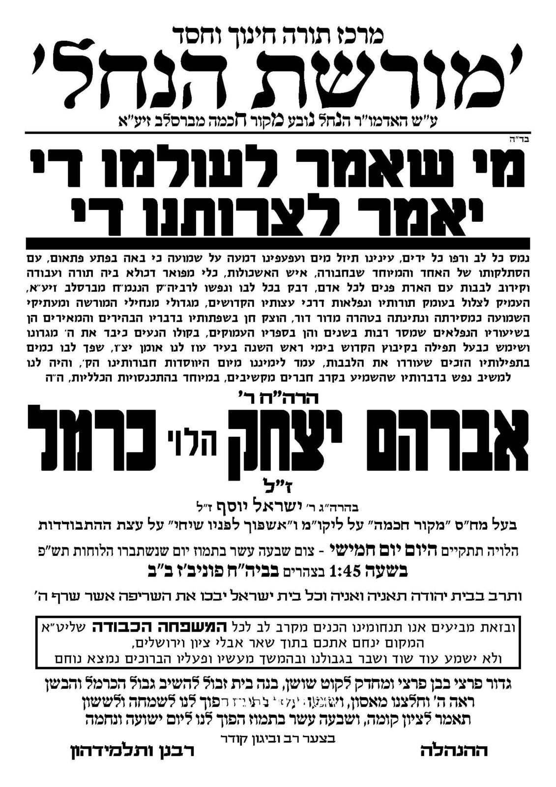 האזינו • להספדים קורעי הלב במסע הלויית הגה”ח רבי אברהם יצחק כרמל זצ”ל, הספידו: הרה"ח רבי נחמן ברגשטיין שליט"א קרא עוד ←