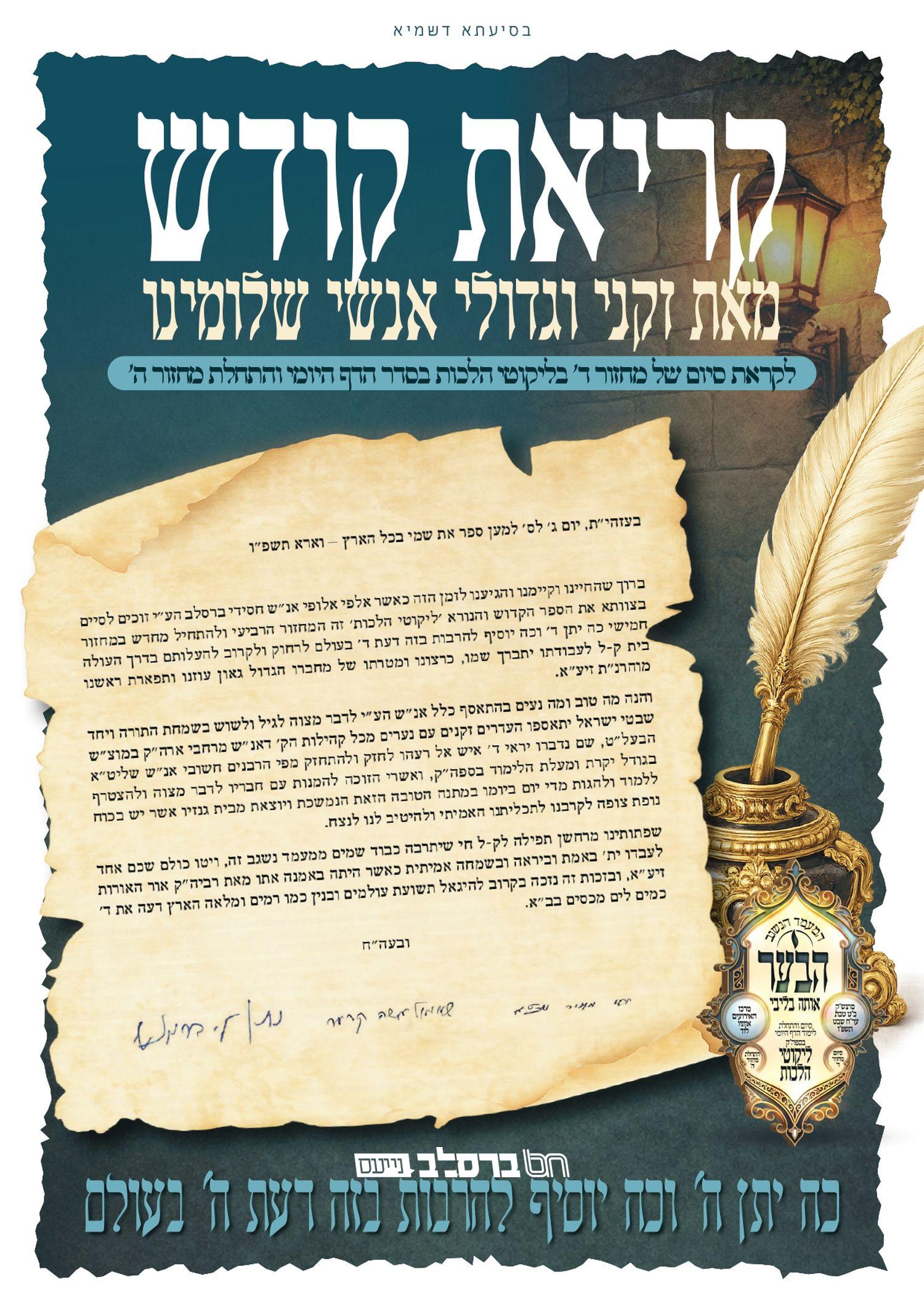 רבבות אלפי אנשי שלומינו חסידי ברסלב די בכל אתר ואתר נערכים בסילודין ובחרדת קודש לקראת המעמד ההיסטורי של סיום הספר הקדוש 'ליקוטי הלכות' שיתקיים במוצאי השבת הקרוב בראשות הרבנים גדולי זקני אנ"ש ועימם כלל משפעי אנ"ש שליט"א. ובדקות האחרונות מתפרסמת קריאתם הקדושה וחסרת התקדים של הרבנים גדולי זקני אנ"ש מנהיגי ברסלב, בגודל יקרת וחשיבות המעמד.