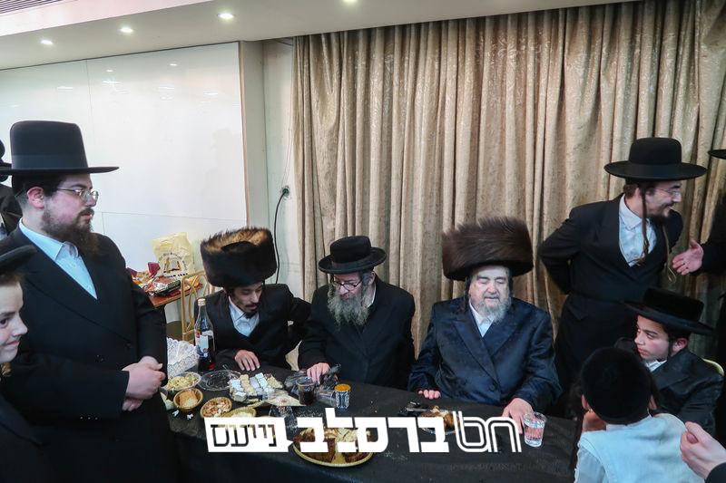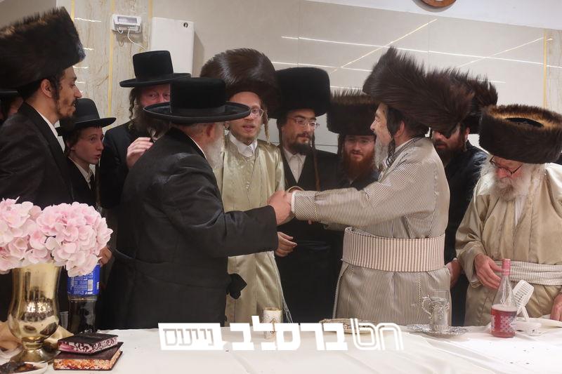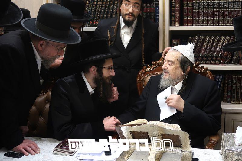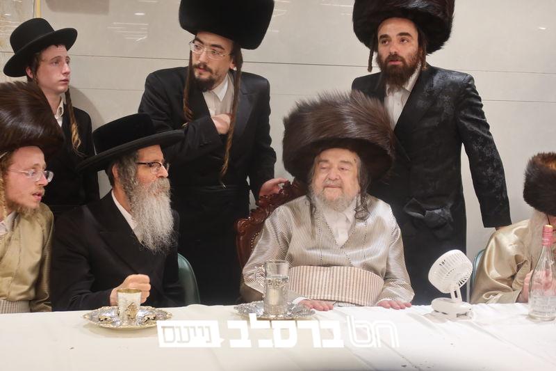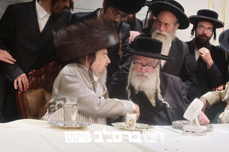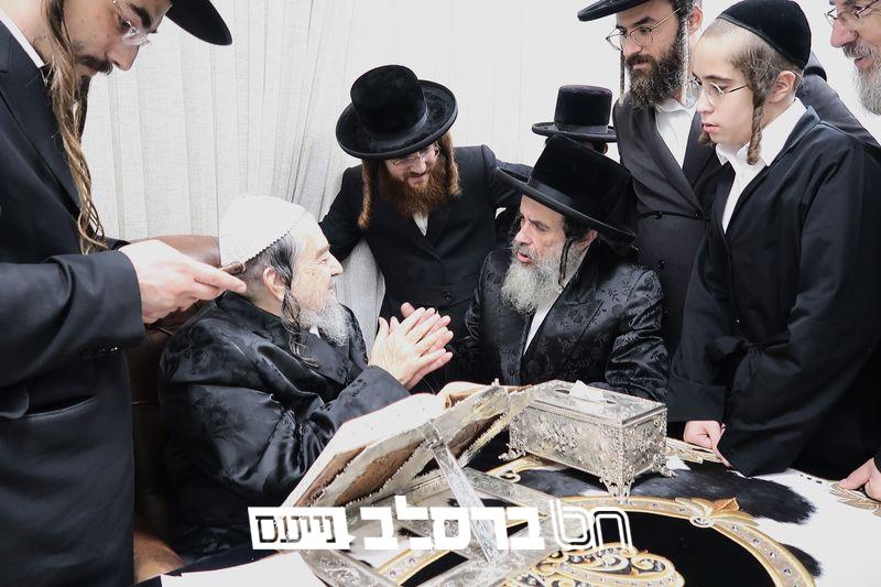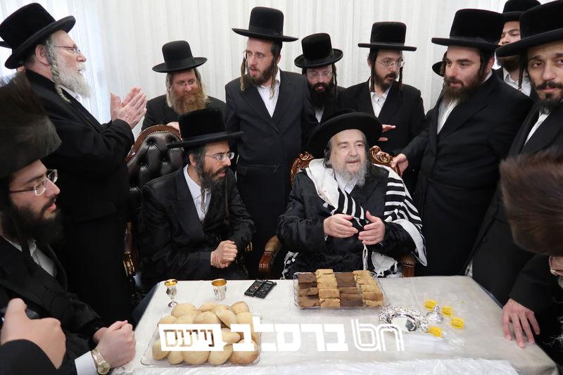 שמחת הברית לנין כ"ק מרן אדמו"ר מסלונים שליט"א בהשתתפות ידיד נעוריו פאר הדור הגה"צ רבי יעקב מאיר שכטער שליט"א. בתחילה בתחילה נועדו לסוד שיח בחדר האדמו"ר שליט"א, ואח"כ נכנסו למעמד הברית מילה. | קרדיט מ. א. נוימן