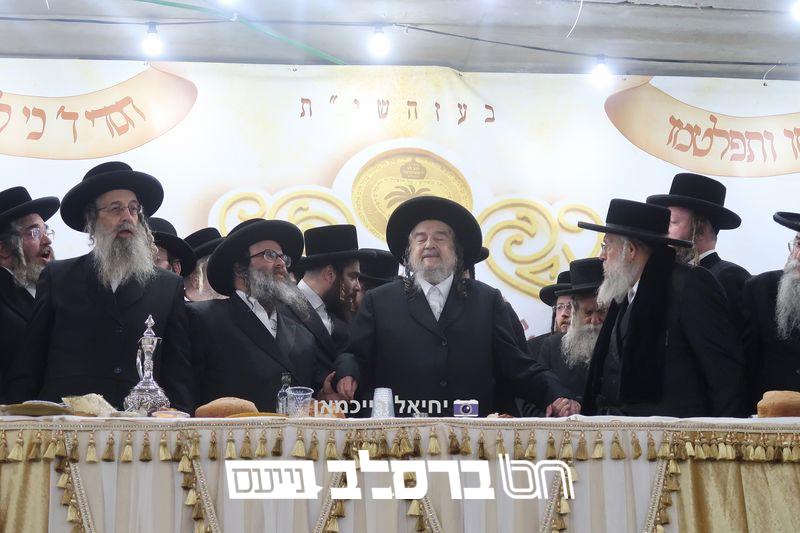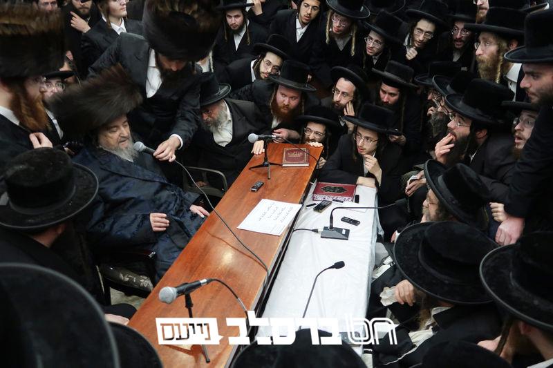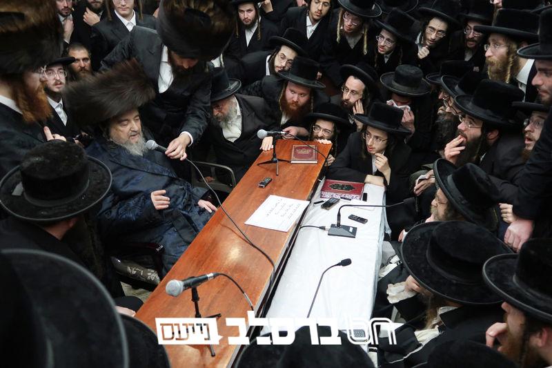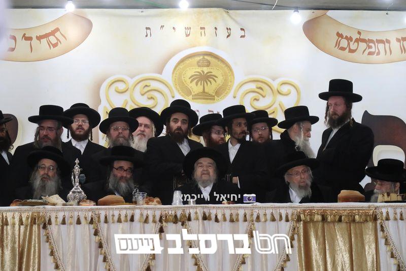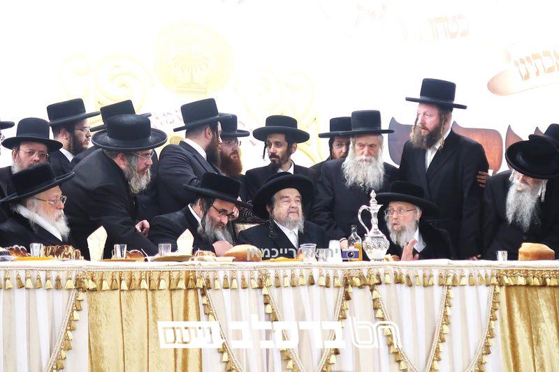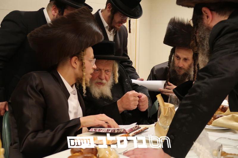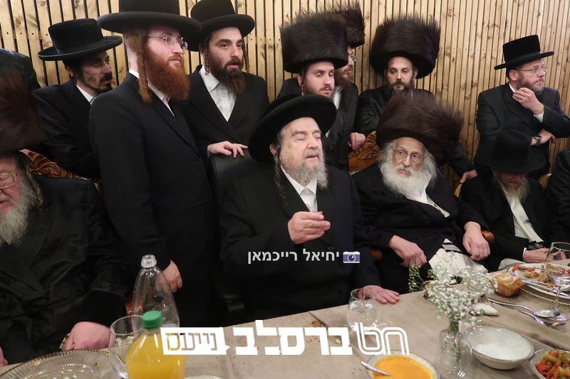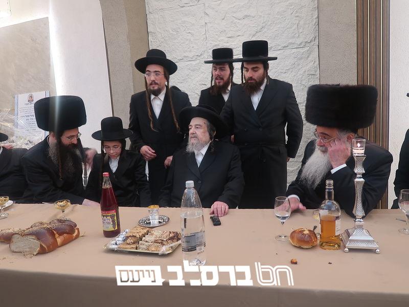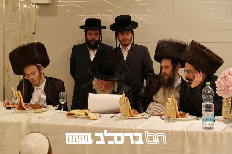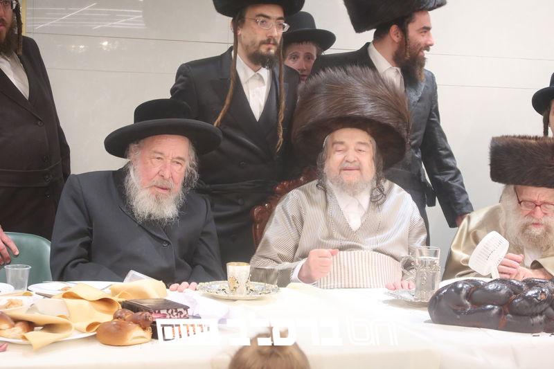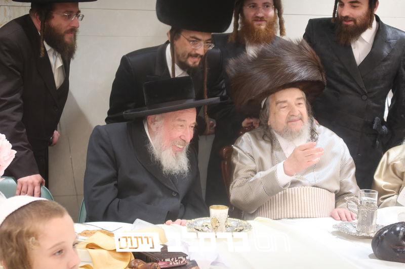 פאר הדתנו ופאר הדור הגה"צ רבי יעקב מאיר שכטער שליט"א משתתף בשמחת השבע ברכות לנכד הגה"צ כ"ק האדמו"ר מהורדנקא שליט"א מגדולי תומכי עניי ארץ ישראל, נראה מרן המשגיח הגה"צ רבי דן סגל שליט"א