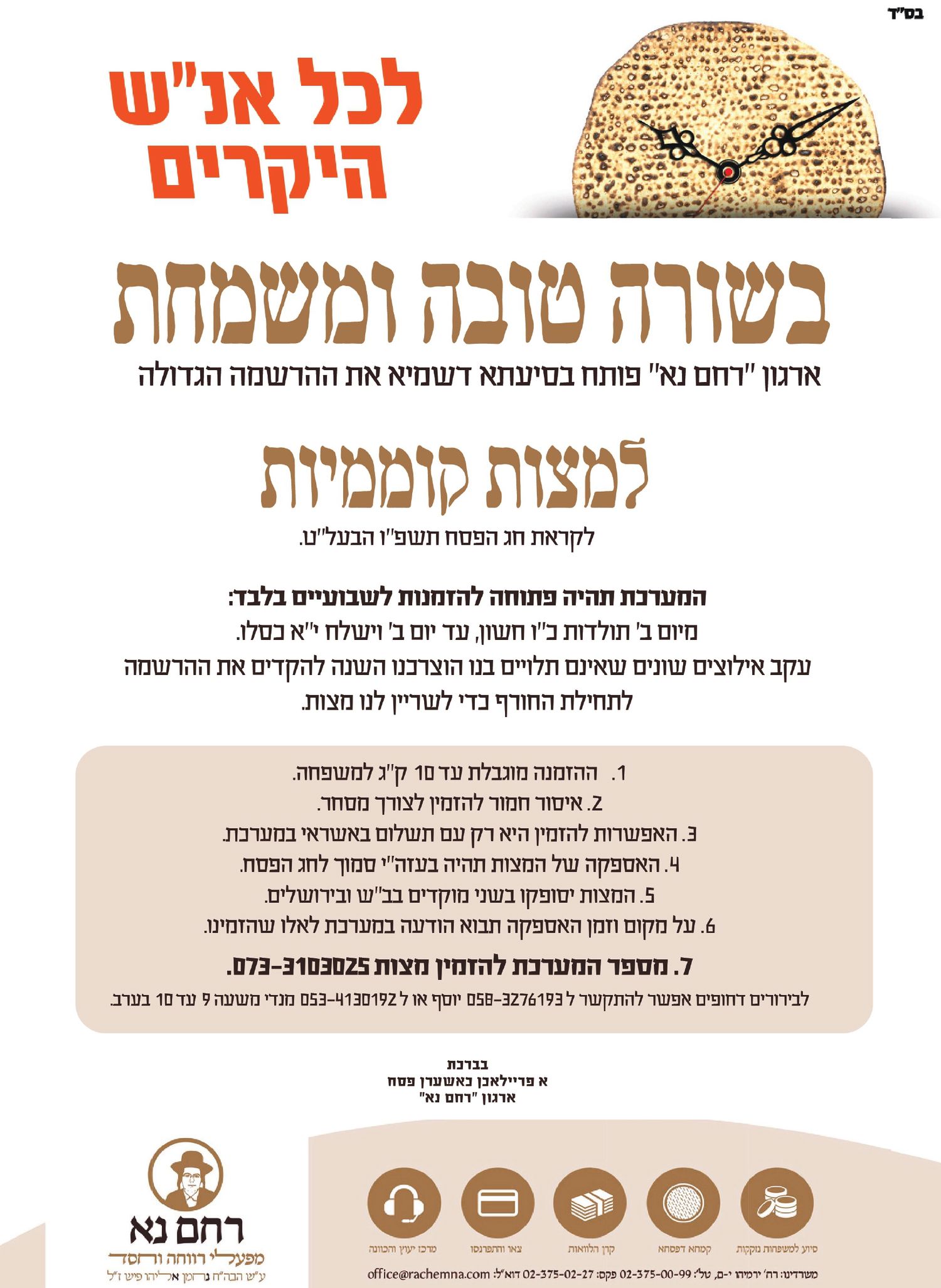 מצוה לפרסם: ארגון החסד של אנ"ש 'רחם נא' המחלק מידי שנה בשנה למאות משפחות של אנ"ש 'מצות קוממיות' לחג הפסח, מודיע כי השנה ההרשמה תפעל בימים אלו בלבד, ההרשמה נפתחה ותסגר בעוד כשבועיים בלבד: