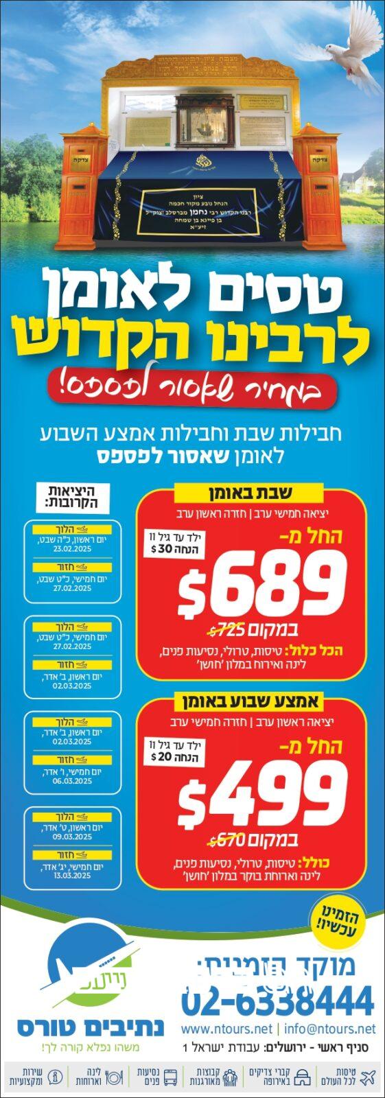 סוכנות הנסיעות 'נתיבים טורס' – הסוכנות הוותיקה של אנ"ש, יוצאת במבצע טיסות מיוחד לציון רבינו הקדוש רבי נחמן מברסלב זיע"א באומן, לשבתות (חמישי-ראשון / שני) או לאמצע השבוע (ראשון / שני-חמישי) במחירים שאסור לפספס.