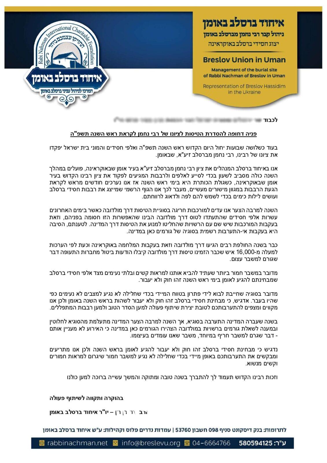 "בפגישותינו עם משרד החוץ בארץ, עוד לפני המשבר", אומר לנו אחד מעסקני "איחוד ברסלב", הבהרנו להם כי איננו מבקשים בעלות ישראלית על האירוע, ובעצם איננו מבקשים מעורבות ישראלית כלל. אנו מבקשים סיוע קונסולרי שמגיע לכל אזרח ישראלי – ותו לא. כאשר פרץ המשבר נוספה לנו טענה קשה: פעלתם כנראה בשנה שעברה מתוך רצון טוב, אולם בפועל נוצר מכך נזק ומשבר של ממש, ואותו אנו דורשים לפתור".
