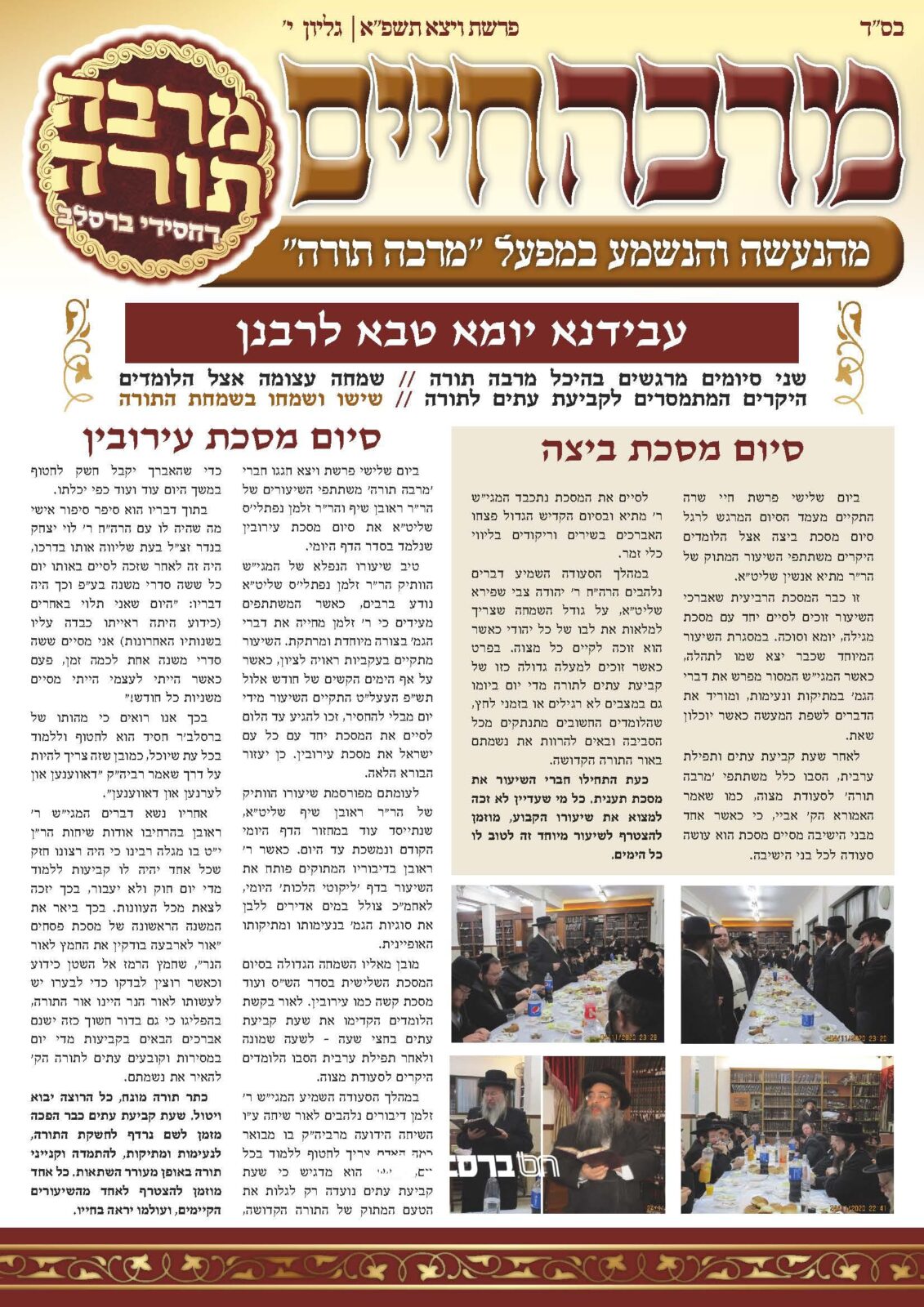 עבידנא יומא טבא לרבנן • צפו בתמונות מסיומים מרגשים על מסכתות עירובין וביצה שהתקיימו בהיכל 'מרבה תורה' שבבית הכנסת הגדול דחסידי ברסלב ה"שול"בירושלים