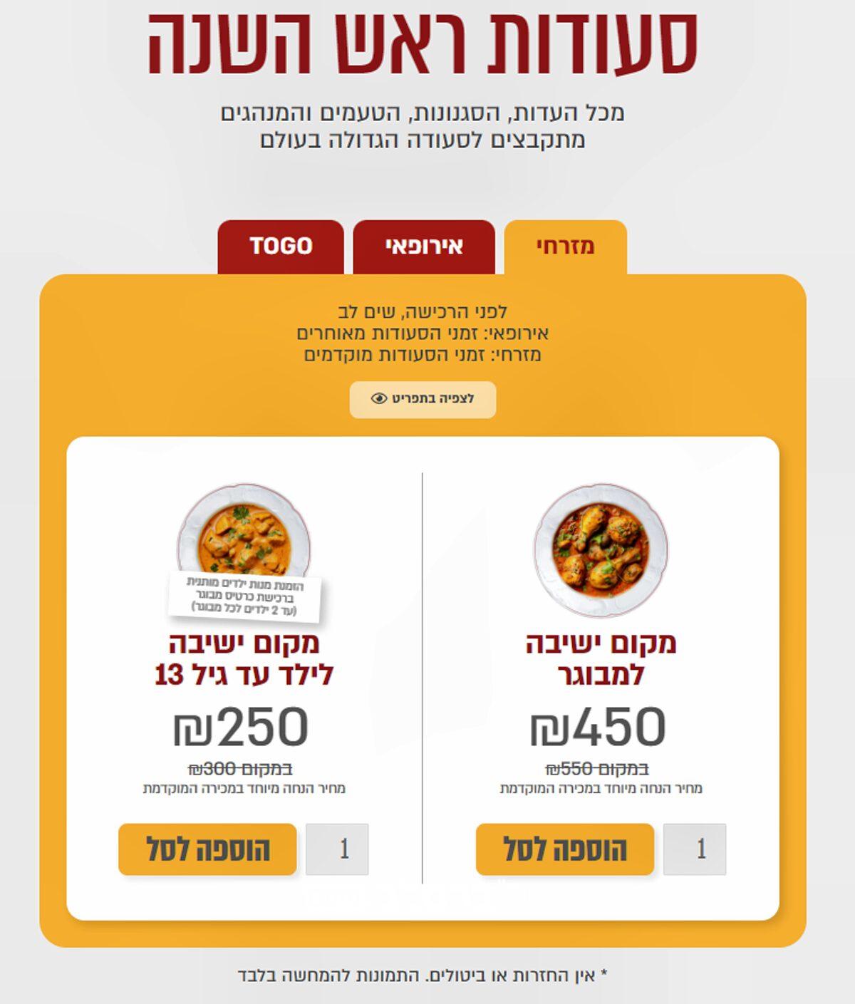 ועכשיו המחיר בהנחה מיוחדת למקדימין: מקום ישיבה למבוגר 450 ₪ במקום 550 ₪ | מקום ישיבה לילד עד גיל 13 – 250 ₪ במקום 300 ₪ (הזמנת מנות ילדים מותנית ברכישת כרטיס מבוגר ומוגבלת לעד 2 ילדים לכל מבוגר) | TO-GO – ארוז אישי – 300 ₪ במקום 350 ₪.