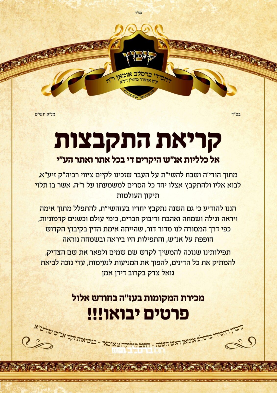 קיבוץ תשפ"א • לקראת הראש השנה של רבינו הקדוש לכו ונלכה. הודעה רשמית על ההתקבצות ה"קיבוץ" בקלויז החדש שבנשיאות זקניקרא עוד ←