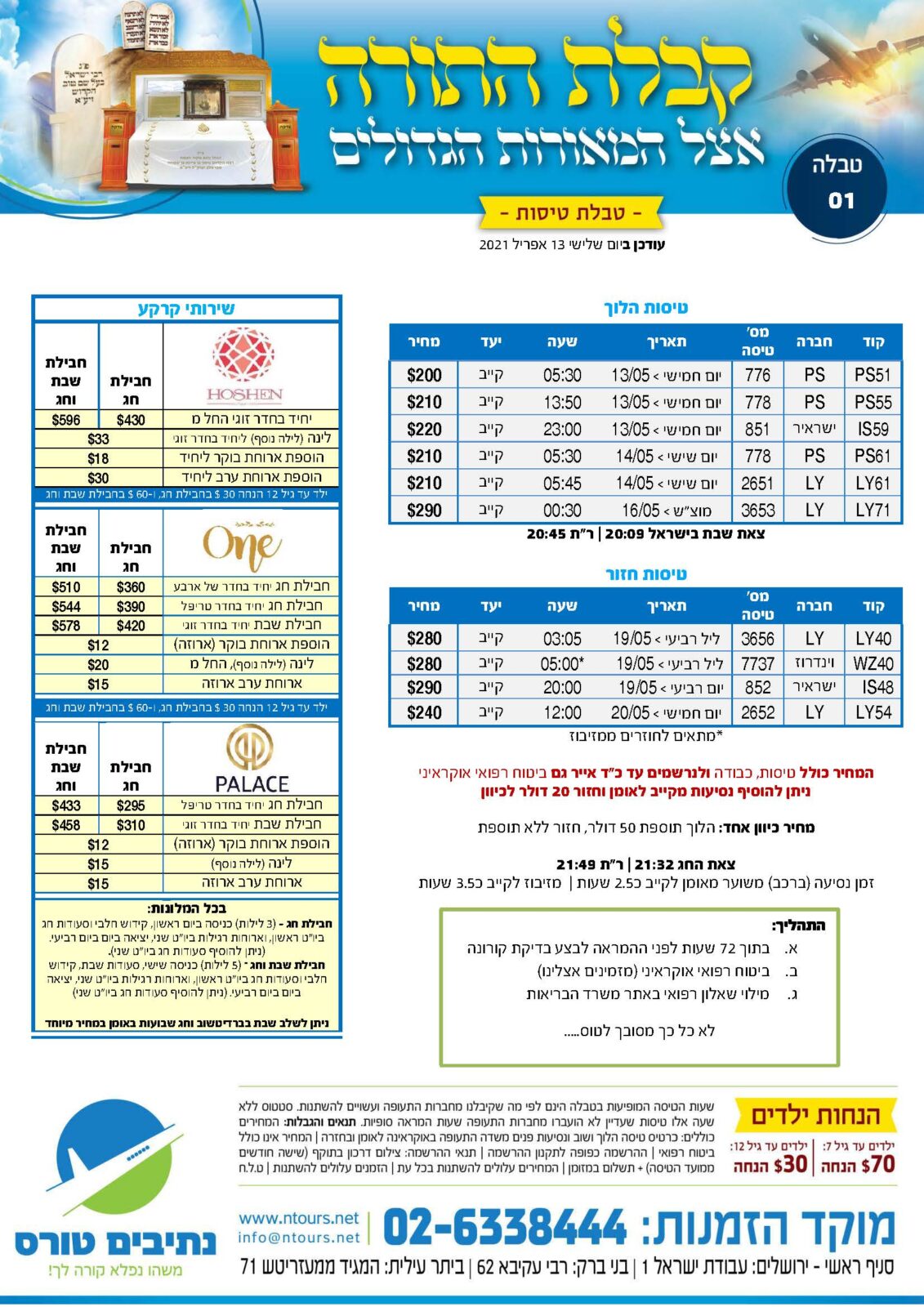 טיסות + כבודה, ולנרשמים עד כ"ד אייר (06.05.2021 – למניינם) גם ביטוח רפואי אוקראיני.