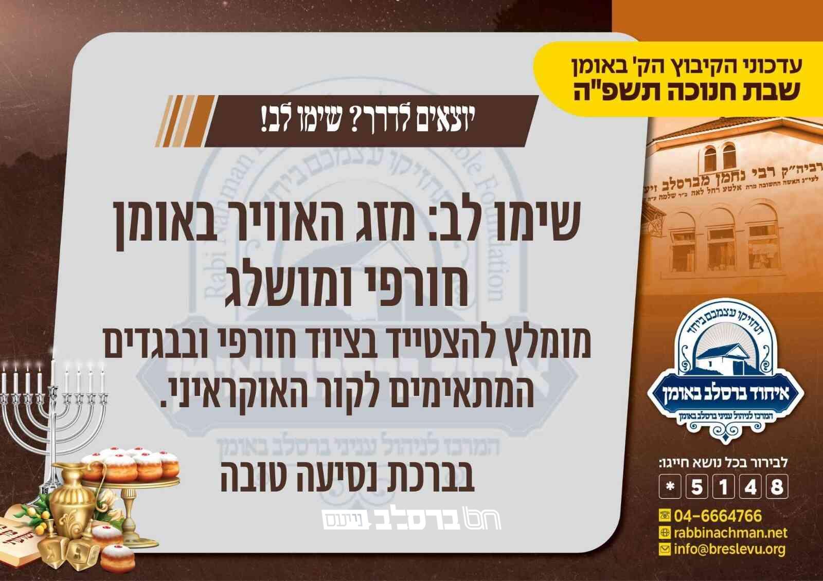 גבאי הציון, הרב נתן צמח הי"ו מבקש לעדכן את הנערכים לצאת לדרך כי החורף כבר הגיע לאוקראינה ומזג האוויר באומן הוא קר מאד ומומלץ לכל הנערכים לצאת לדרך להצטייד בביגוד מתאים למזג אוויר חורפי ומושלג.