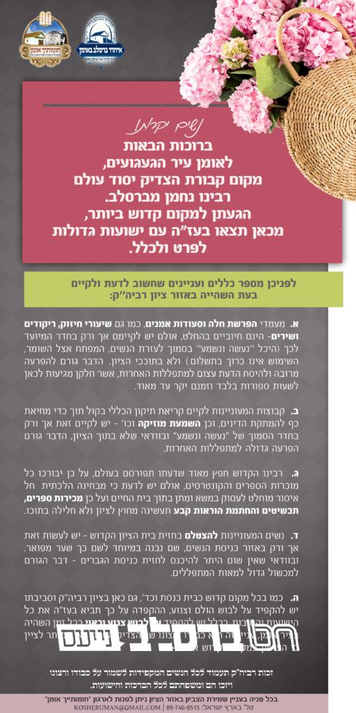 ארגון "חומותיך אומן" – העוסק בשמירת הצביון הראוי באזור ציון רבינו הקדוש באומן – בשיתוף פעולה עם "איחוד ברסלב" – המנהל בחכמה ובתבונה את ניהול הציון הקדוש, פועלים באופן אינטנסיבי וחובק למען הסדרת כללי התנהגות ברורים בעזרת הנשים בציון רביה"ק.