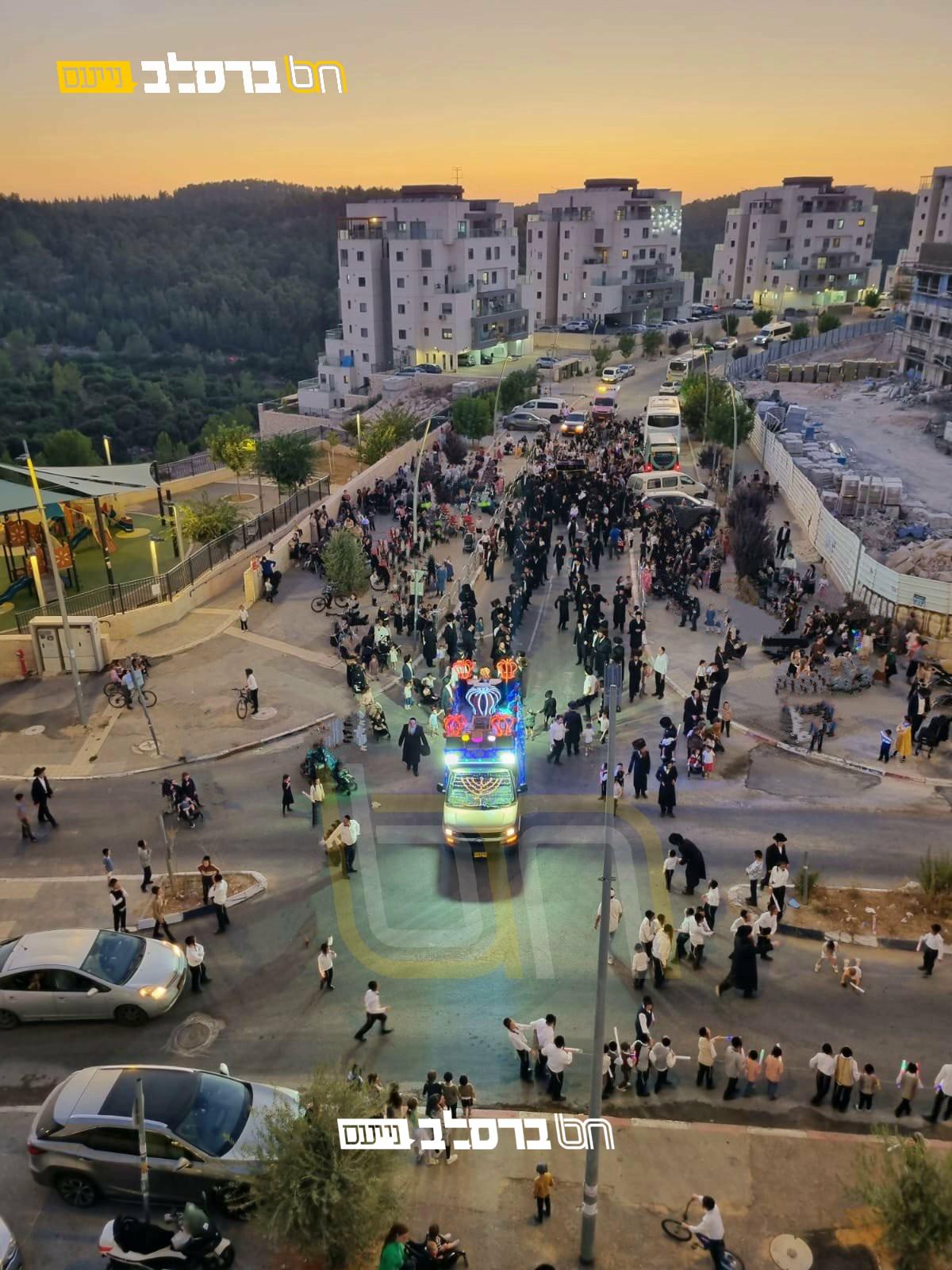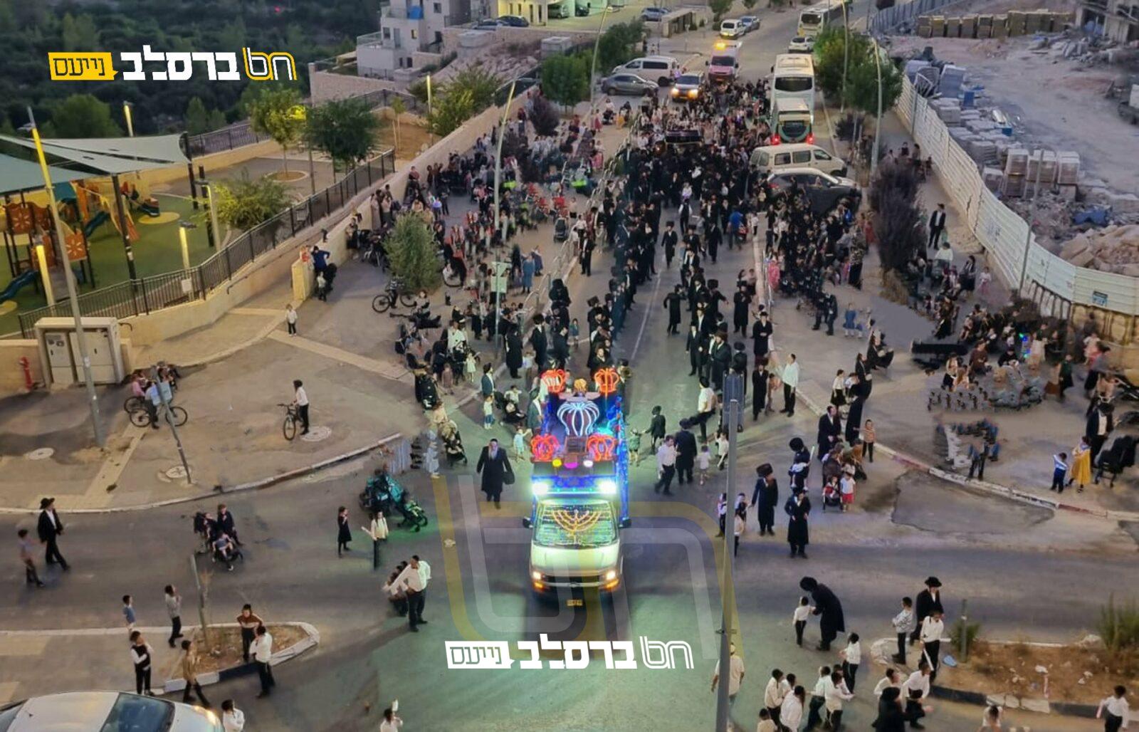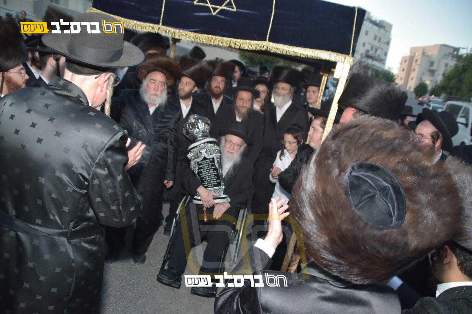 לאחמ"כ התכנסו בני המשפחה, כאשר הם לבושים בבגדי שבת, ויצאו בהשתתפות קהל נכבד ובראשם ראש המשפחה הרה"ח ר' יעקב פרלמוטר שליט"א, לתהלוכת הכבוד לכבודה של תורה בליוויי כלי זמר, כאשר לפניהם מהלכים צעירי הצאן ואבוקותיהן בידיהם בראש התהלוכה, עד לשערי בית הכנסת 'ברסלב' החדש, כאשר בכל הדרך מרקדים מפזזים ומכרכרים כולם בלבת אש קודש ושמחה של מצוה לפני ה' בתופים ובמחולות. כאשר אלפים מתושבי השכונה מצטרפים ובאים אף הם לחלוק כבוד לתורה.