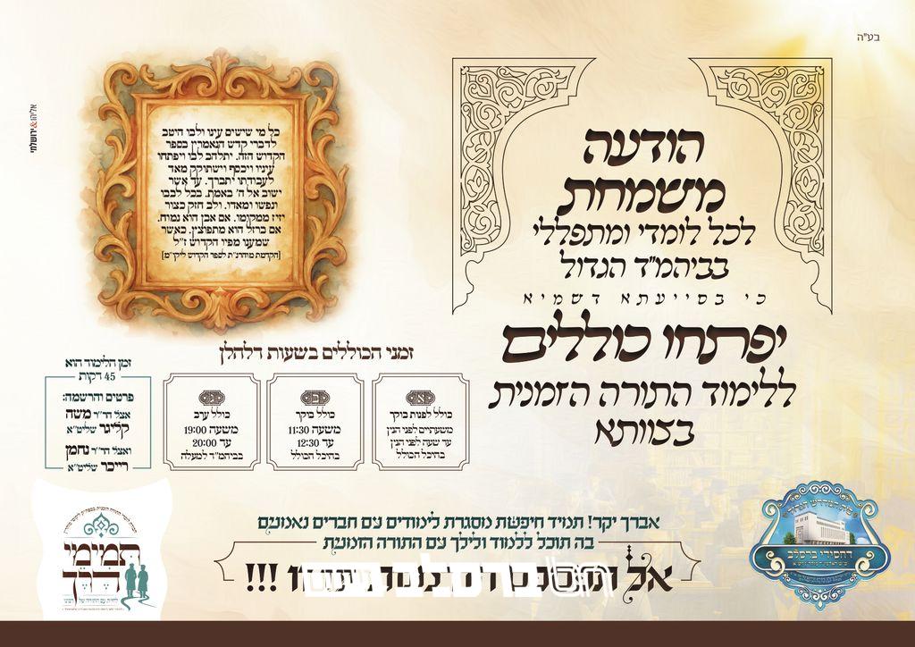 ראשי » חדשות » התורה הזמנית • ארגון 'תמימי דרך' פותח רשת כוללים ב'שוהל'