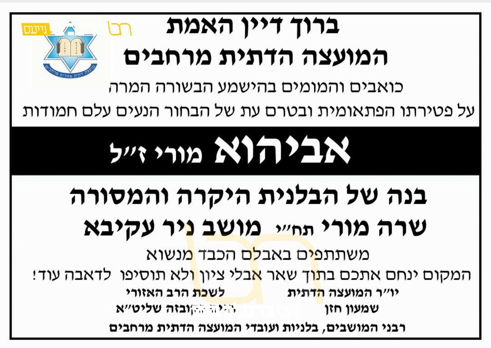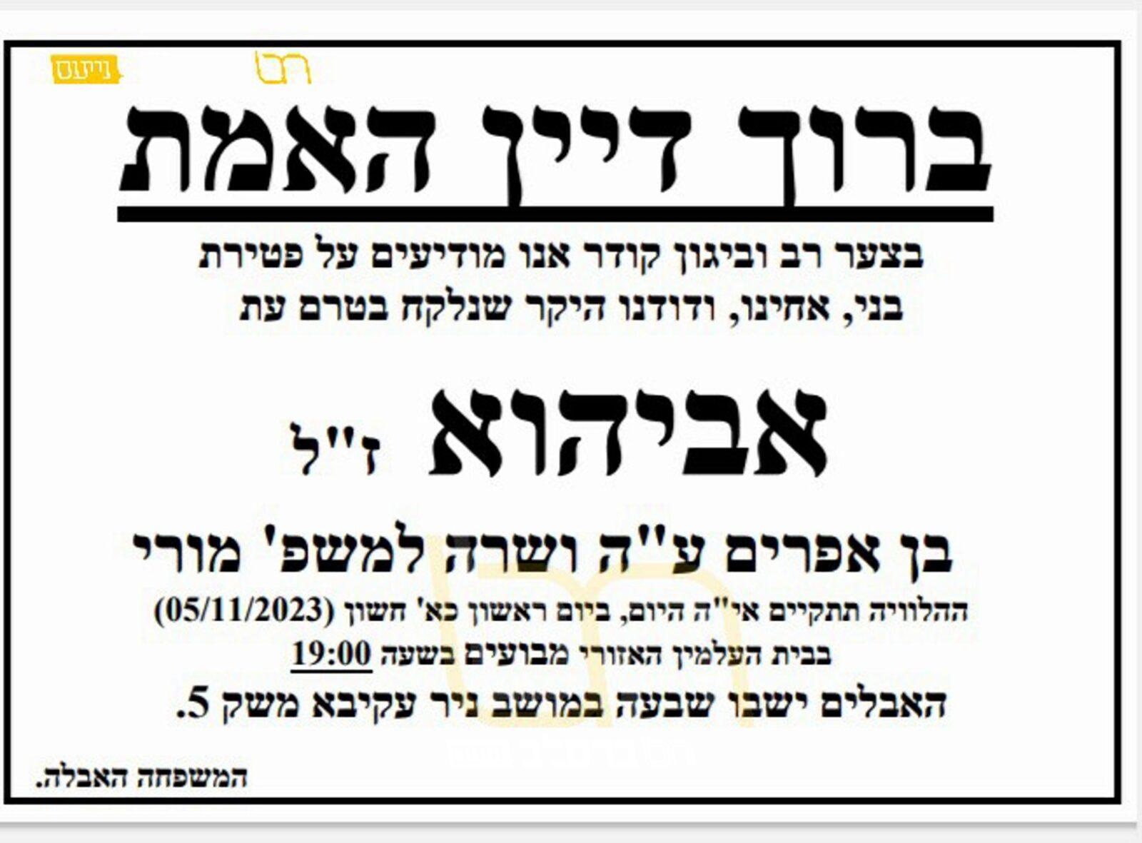 היום (ראשון) קמו מהשבעה בני משפחת מורי היקרה, לאחר שהסתלק לבית עולמו בנסיבות טרגיות הבחור היקר אביהוא מורי ז"ל ממושב ניר עקיבא שבדרום הארץ, ועלה בסערה השמימה בפתאומיות.