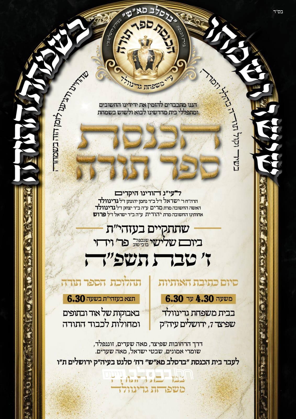 המעמד יערך בעזהי"ת ביום שלישי ז' טבת הבעלט"א, בו ייכנס 'ספר התורה' המהודר ברוב פאר והדר בשערי בית הכנסת 'אור הנעלם' של חסידי ברסלב.