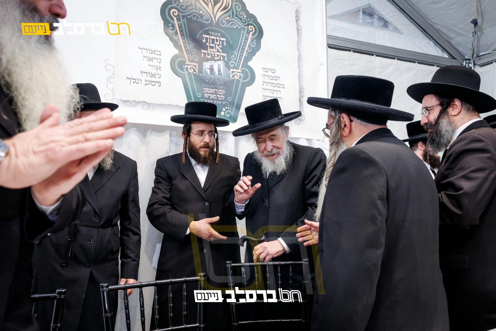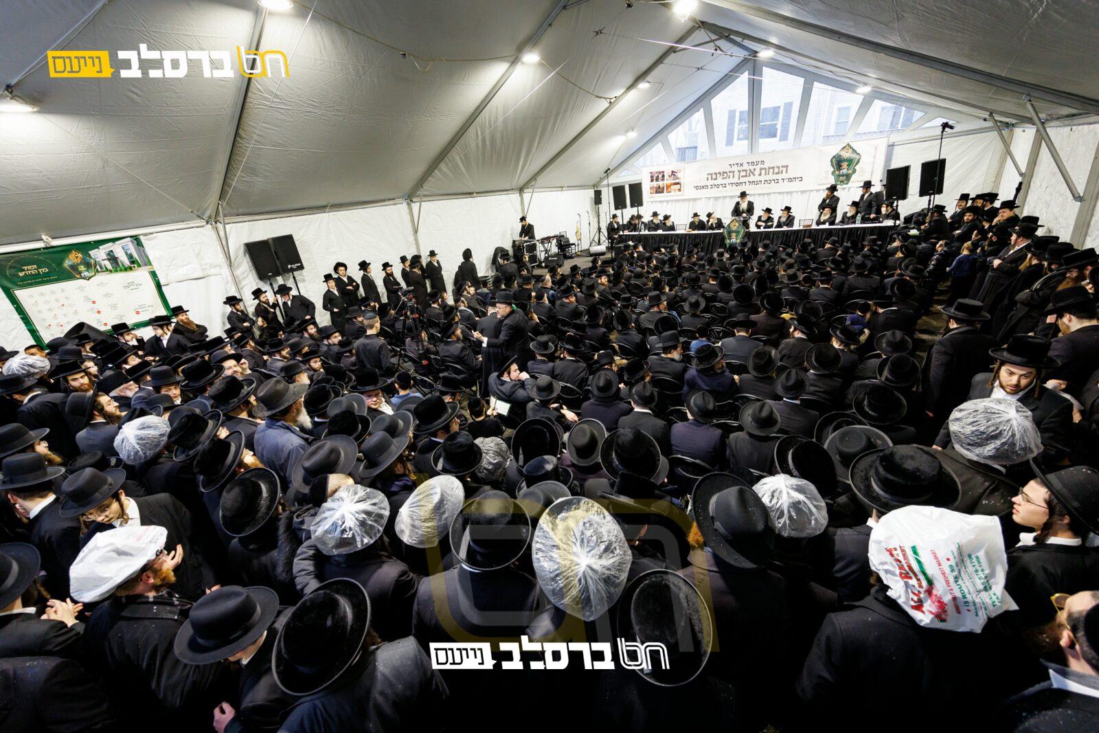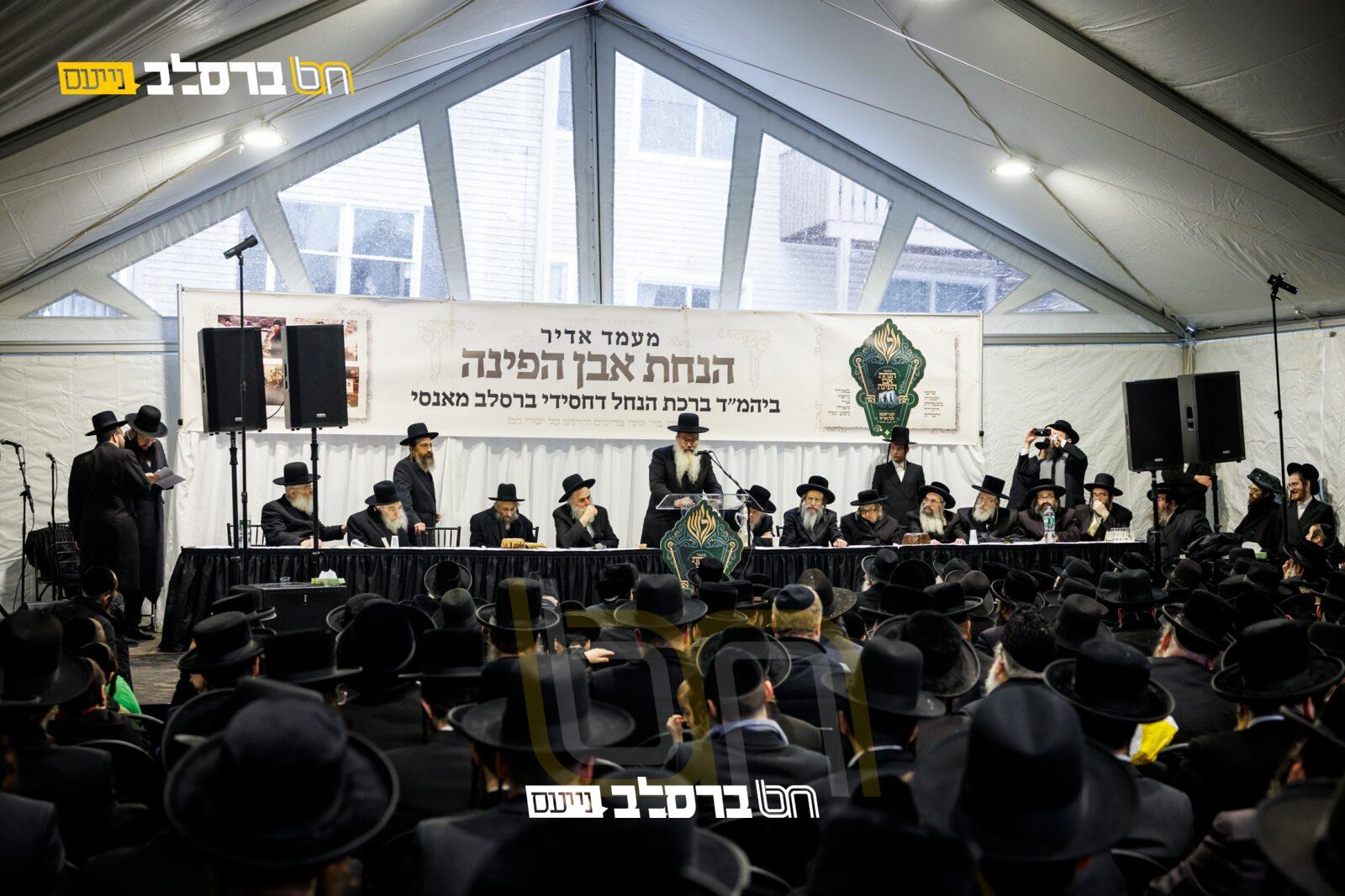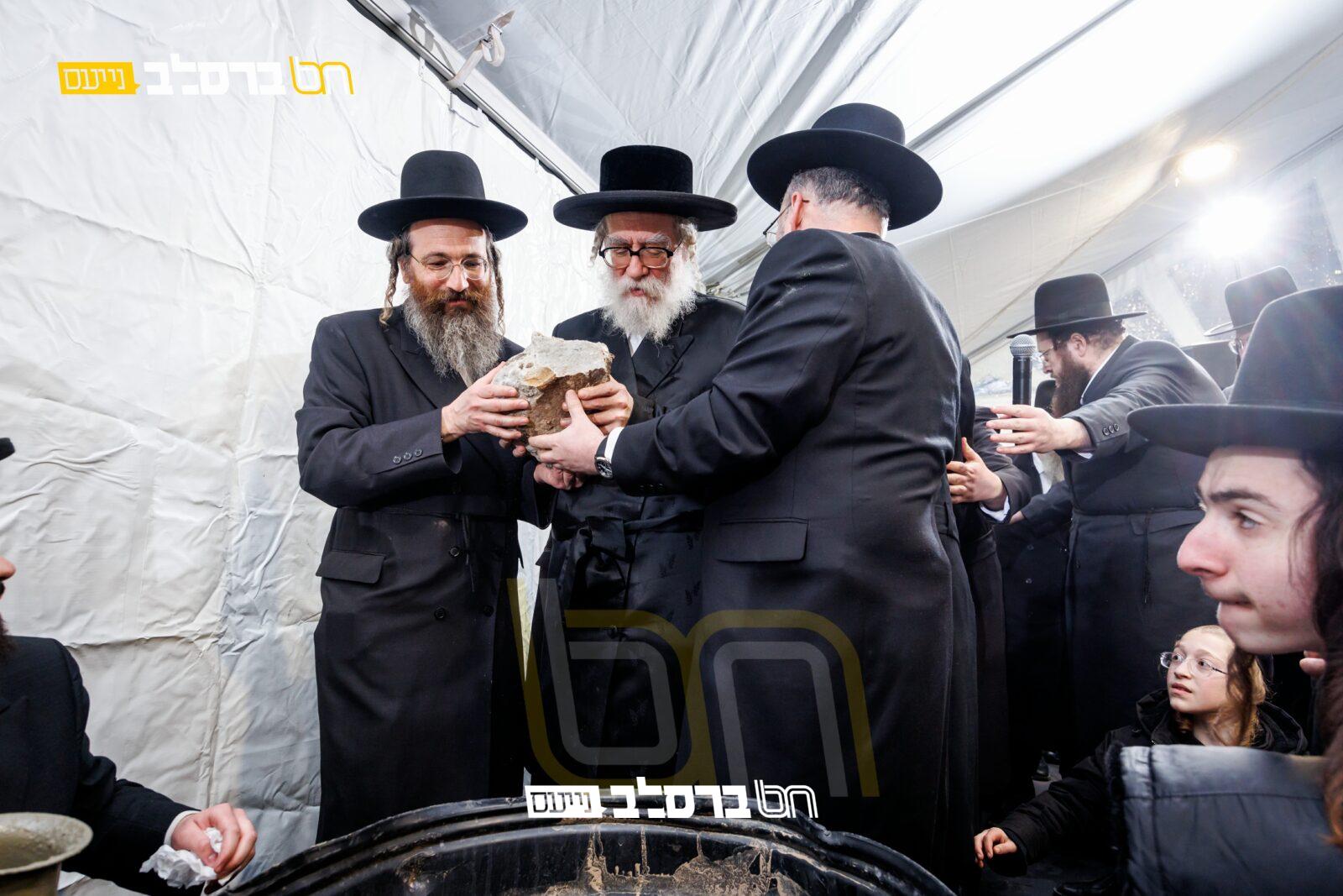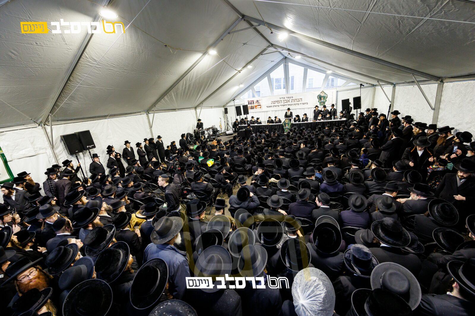 המעמד נערך באהל ענק שנבנה בסמוך למקום בניית הבניין והתקיים בהשתתפות מאות מיקירי אנשי שלומינו זקנים עם נערים בחורים לצד חסידים ואנשי מעשה עטורי זקנה ושיבה הע"י, כולם באו ונקבצו לך להשתתף במעמד ההיסטורי והנשגב. כאשר את המעמד ההיסטורי מנחה ברוב כשרון נופת צופים המגיד העולמי הרה"ח ר' מאיר מרדכי בערקאוויטש שליט"א מיקירי אנ"ש בארה"ב. ובין הייתר נשמעו דברים מפי הגה"צ רבי משה קרעמער שליט"א, כן נשמעו דברים מפי הגה"צ רבי יעקב מאיר שכטער שליט"א בלייב־הוקאפ (שידור חיי). ומעוד רבנים חשובים.