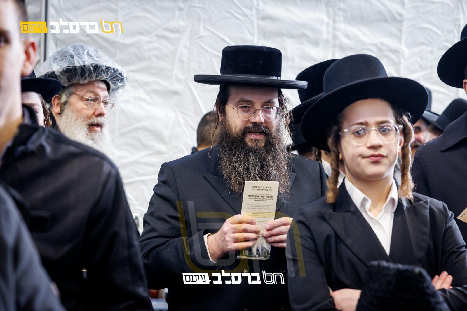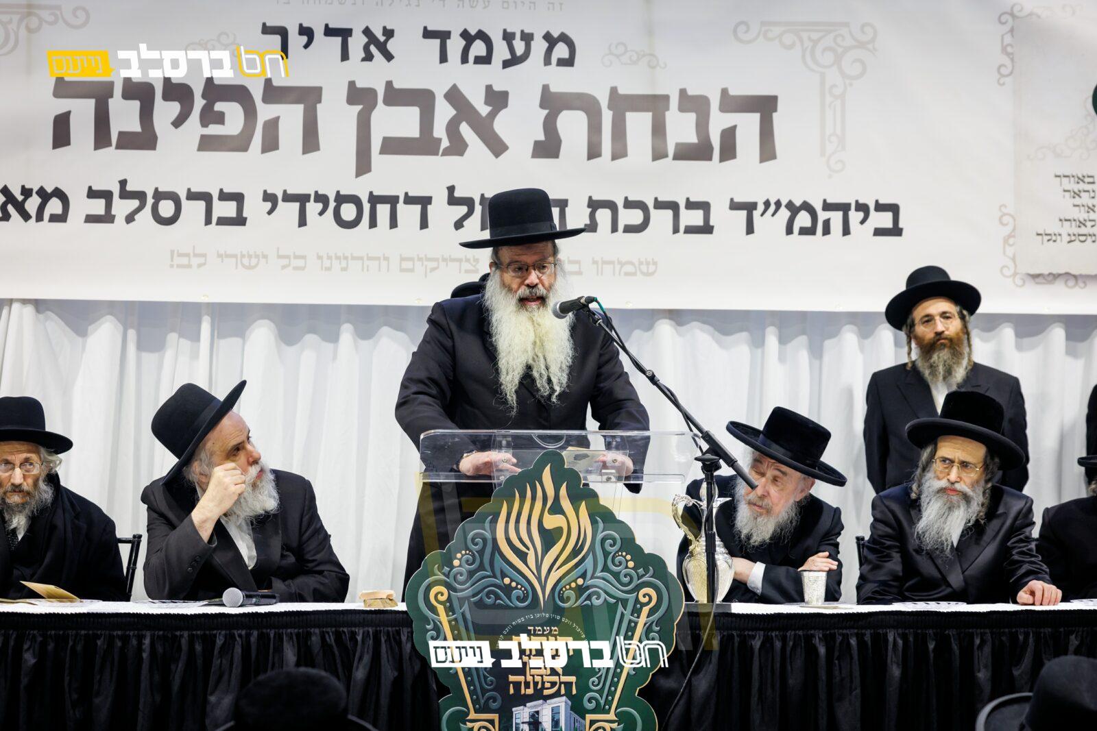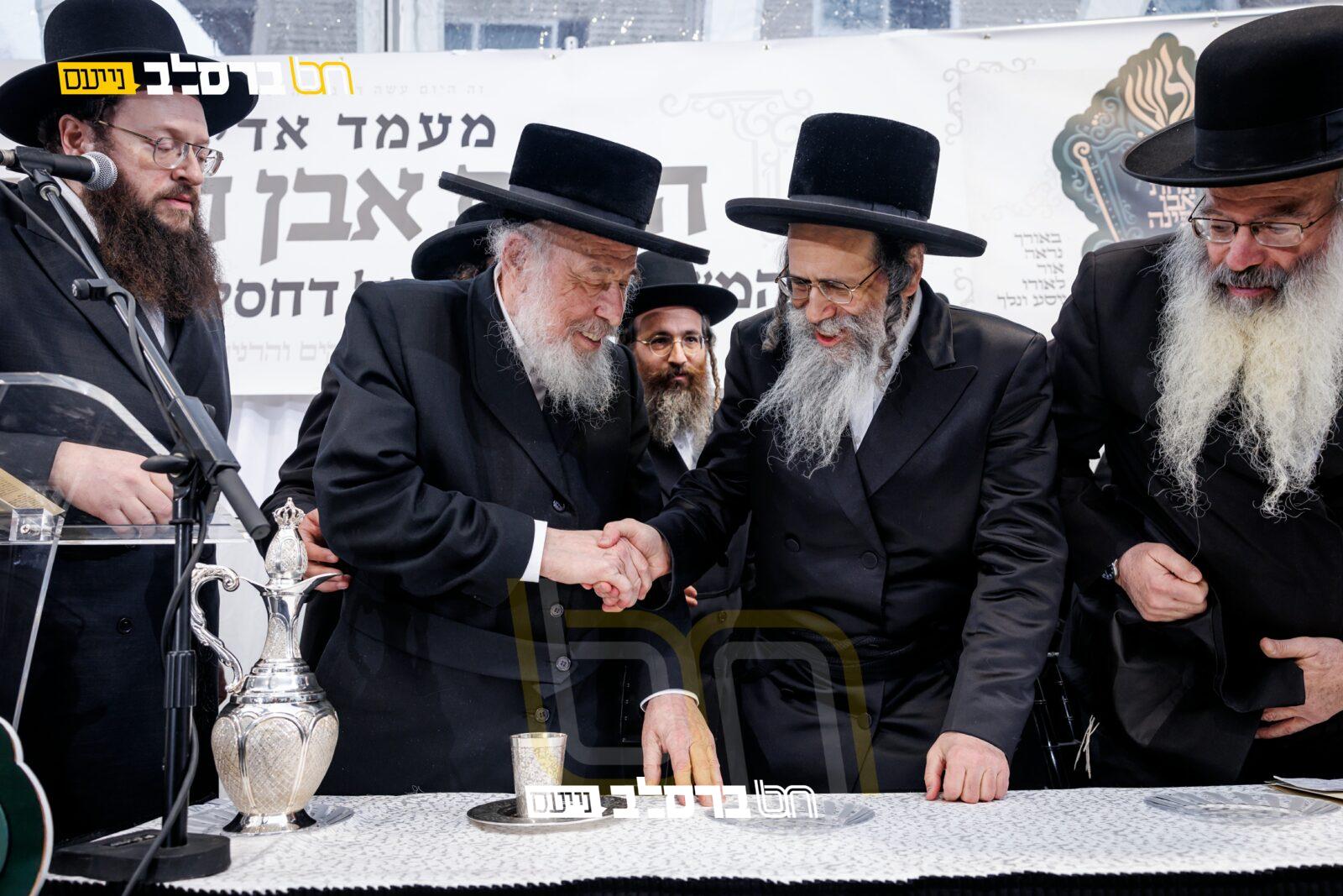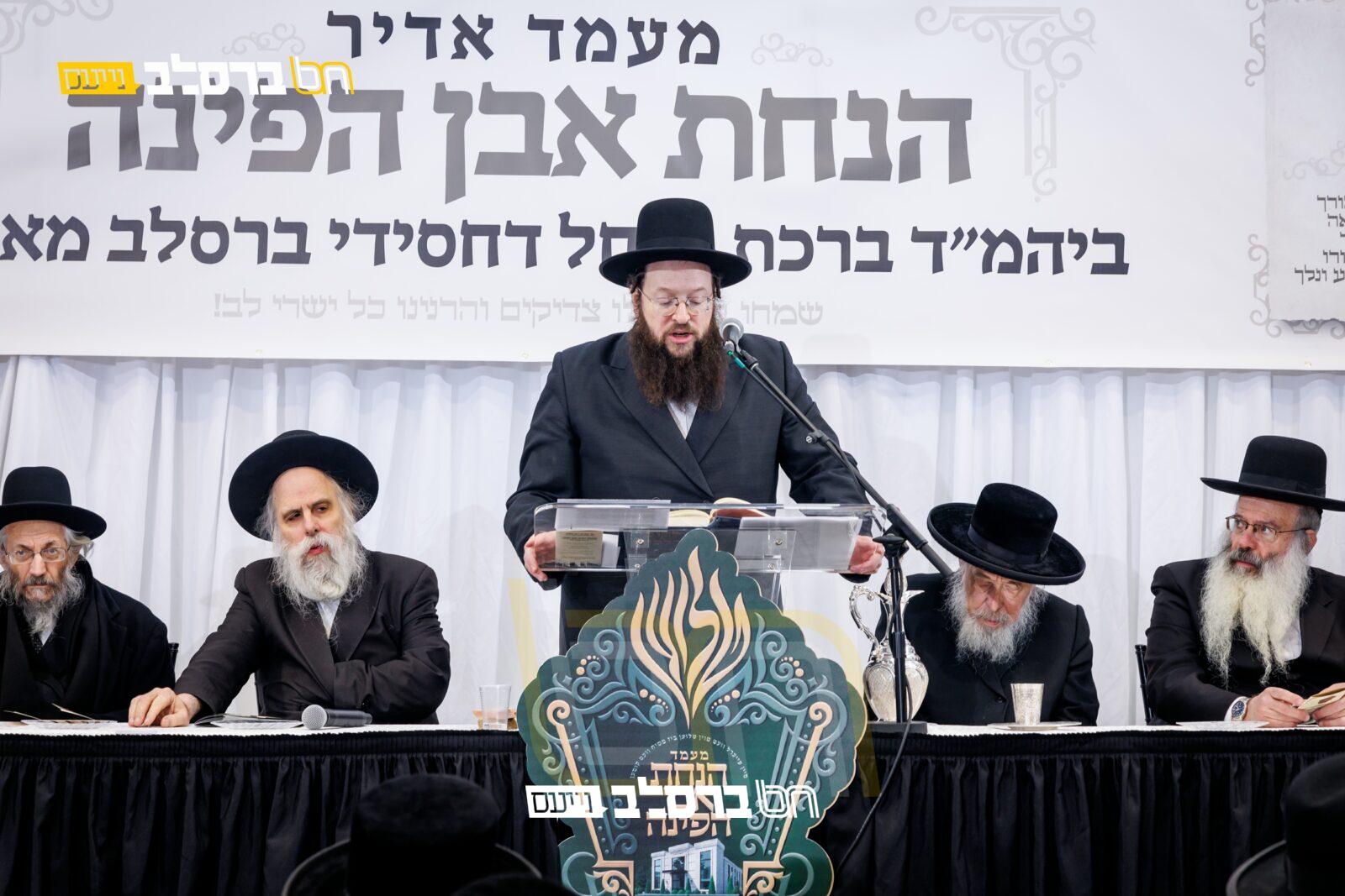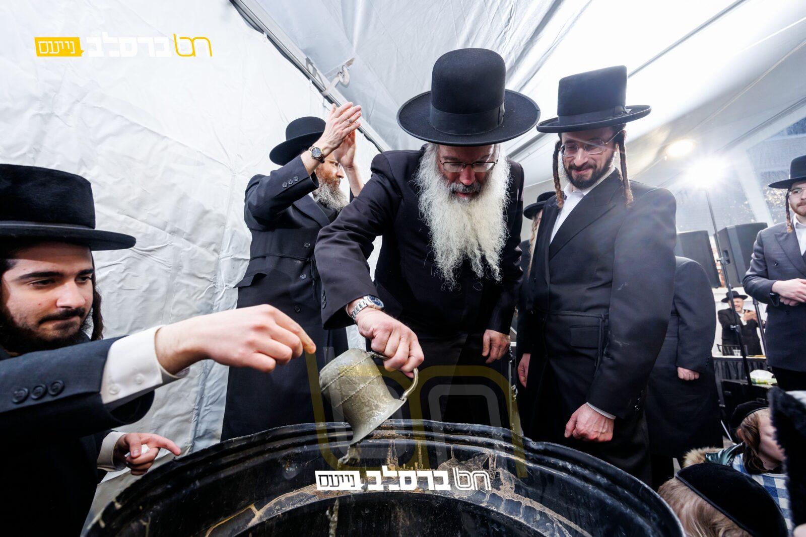 המעמד נערך באהל ענק שנבנה בסמוך למקום בניית הבניין והתקיים בהשתתפות מאות מיקירי אנשי שלומינו זקנים עם נערים בחורים לצד חסידים ואנשי מעשה עטורי זקנה ושיבה הע"י, כולם באו ונקבצו לך להשתתף במעמד ההיסטורי והנשגב. כאשר את המעמד ההיסטורי מנחה ברוב כשרון נופת צופים המגיד העולמי הרה"ח ר' מאיר מרדכי בערקאוויטש שליט"א מיקירי אנ"ש בארה"ב. ובין הייתר נשמעו דברים מפי הגה"צ רבי משה קרעמער שליט"א, כן נשמעו דברים מפי הגה"צ רבי יעקב מאיר שכטער שליט"א בלייב־הוקאפ (שידור חיי). ומעוד רבנים חשובים.